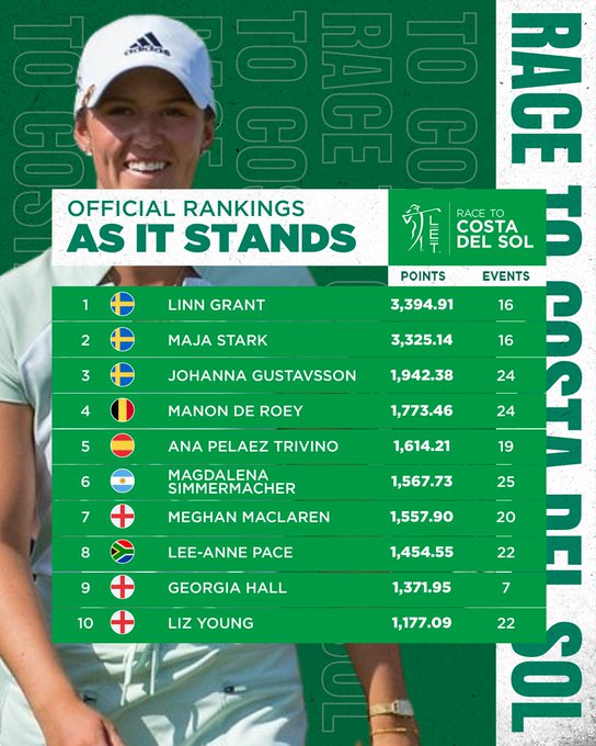 A falta de un evento, el Andalucía Open de España de golf femenino, Linn Grant( Succia ) continúa liderando la Race to Costa del Sol 2022 con 3.394,91 puntos, mientras que Maja Stark ( O) se encuentra 69,77 por detrás en segundo lugar.