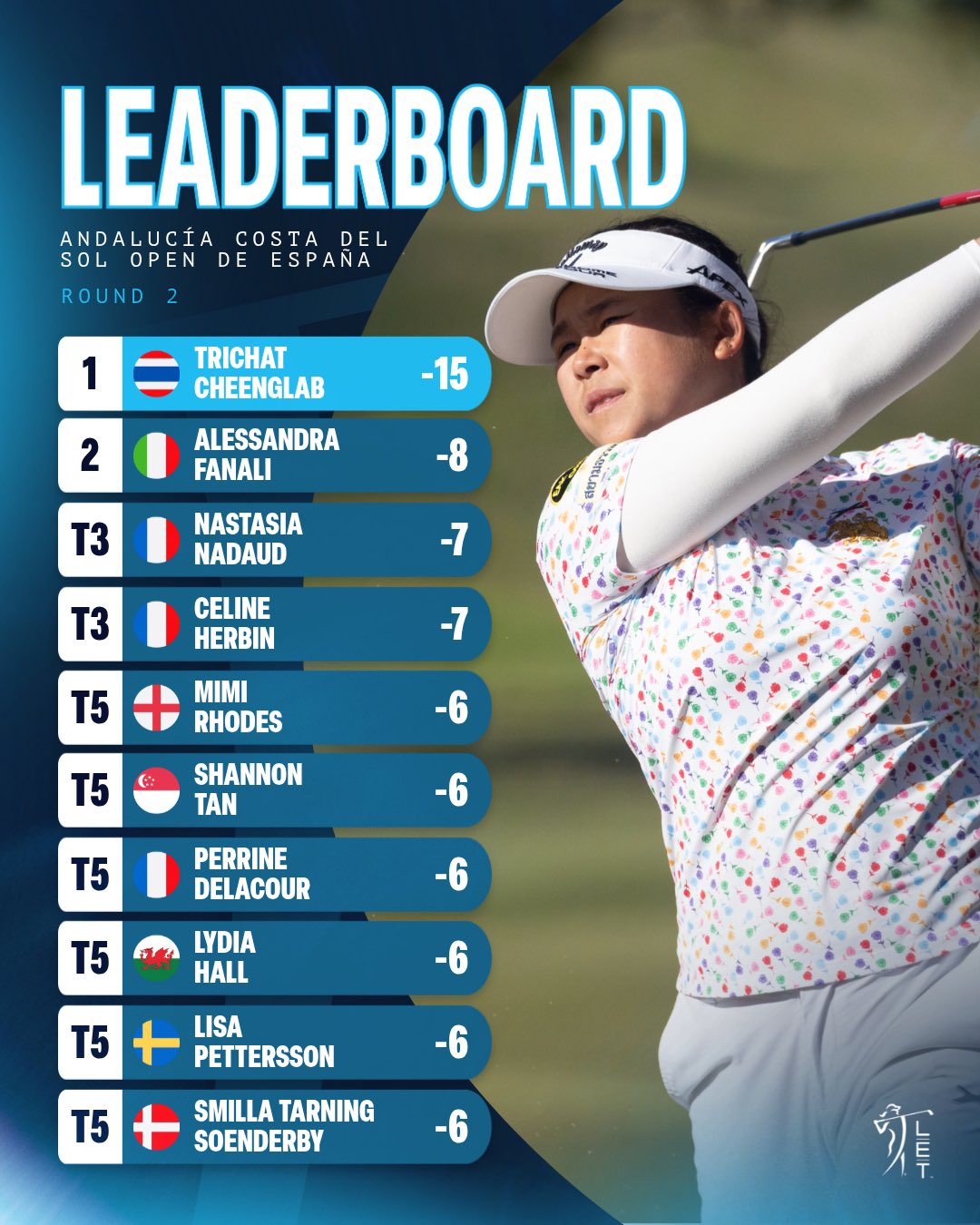 Por detrás de la imparable líder tailandesa, la clasificación presenta una lucha muy abierta. La italiana Alessandra Fanali es segunda en solitario con -8, mientras que las francesas Nastasia Nadaud y Céline Herbin comparten la tercera plaza (-7). Y, cómo no, la batalla por la Orden de Mérito sigue encendida: tanto Shannon Tan como Mimi Rhodes firmaron un sólido -6 total que mantiene en alto un duelo que promete emoción hasta el domingo.