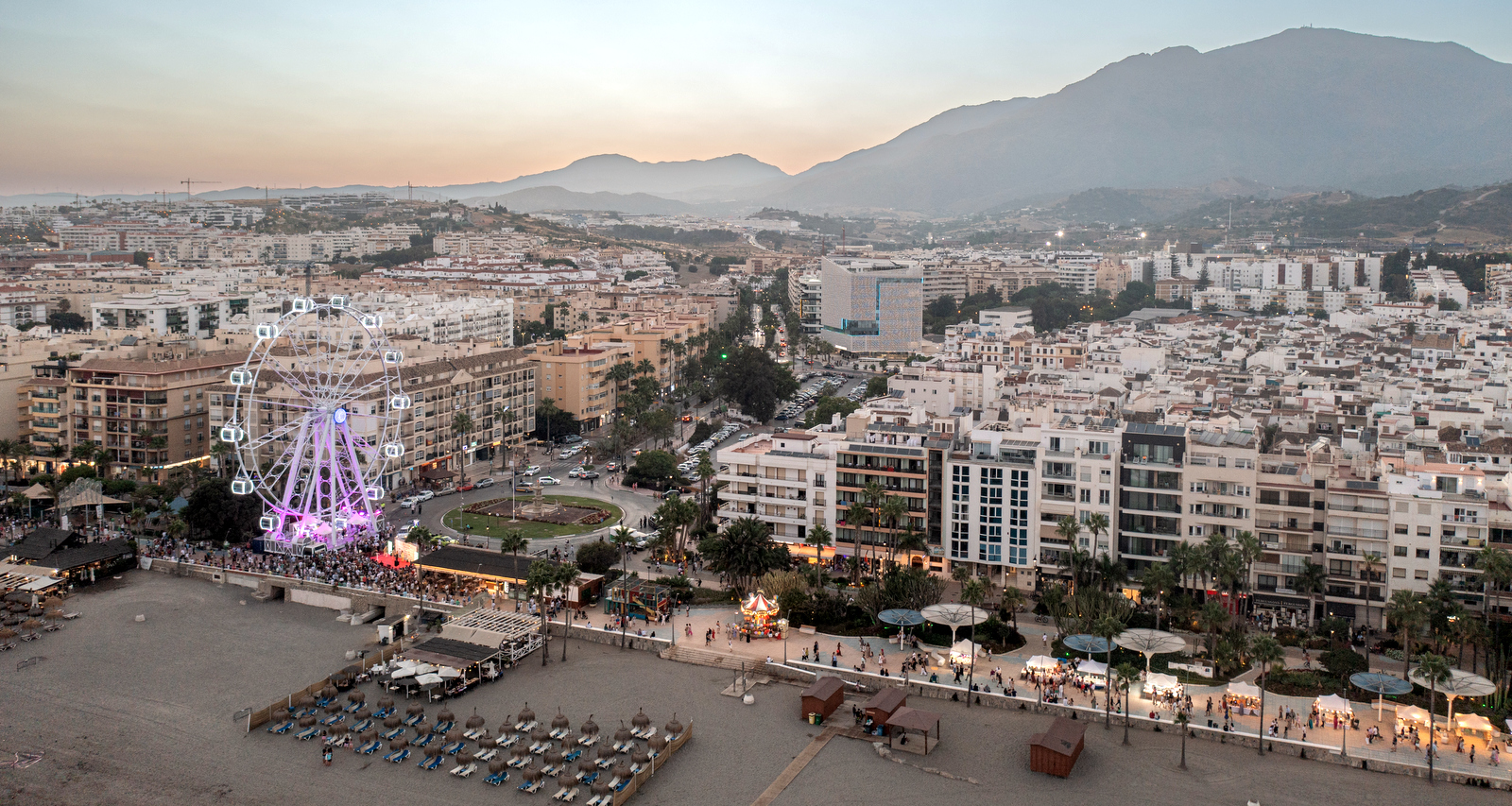 El Ayuntamiento de Estepona informa que la noria panorámica de 40 metros de altura montada en el Paseo Marítimo desde