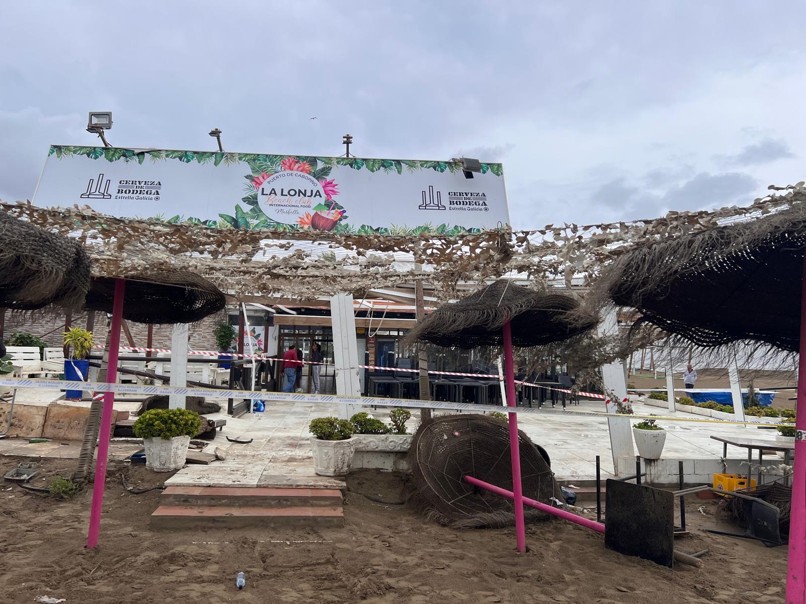 Los daños se han centrado sobre la manga de agua avistada en Cabopino, cuya llegada a tierra ha afectado al Chiringuito La Lonja, cuyo tejado ha volado literalmente y ha provocado la actuación urgente del Cuerpo de Bomberos para retirar sus restos incrustrados en las vivienas colindantes.