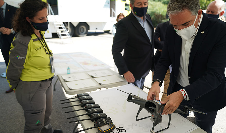 El consejero de la Presidencia viendo uno de los drones que facilitan las labores del GREA.