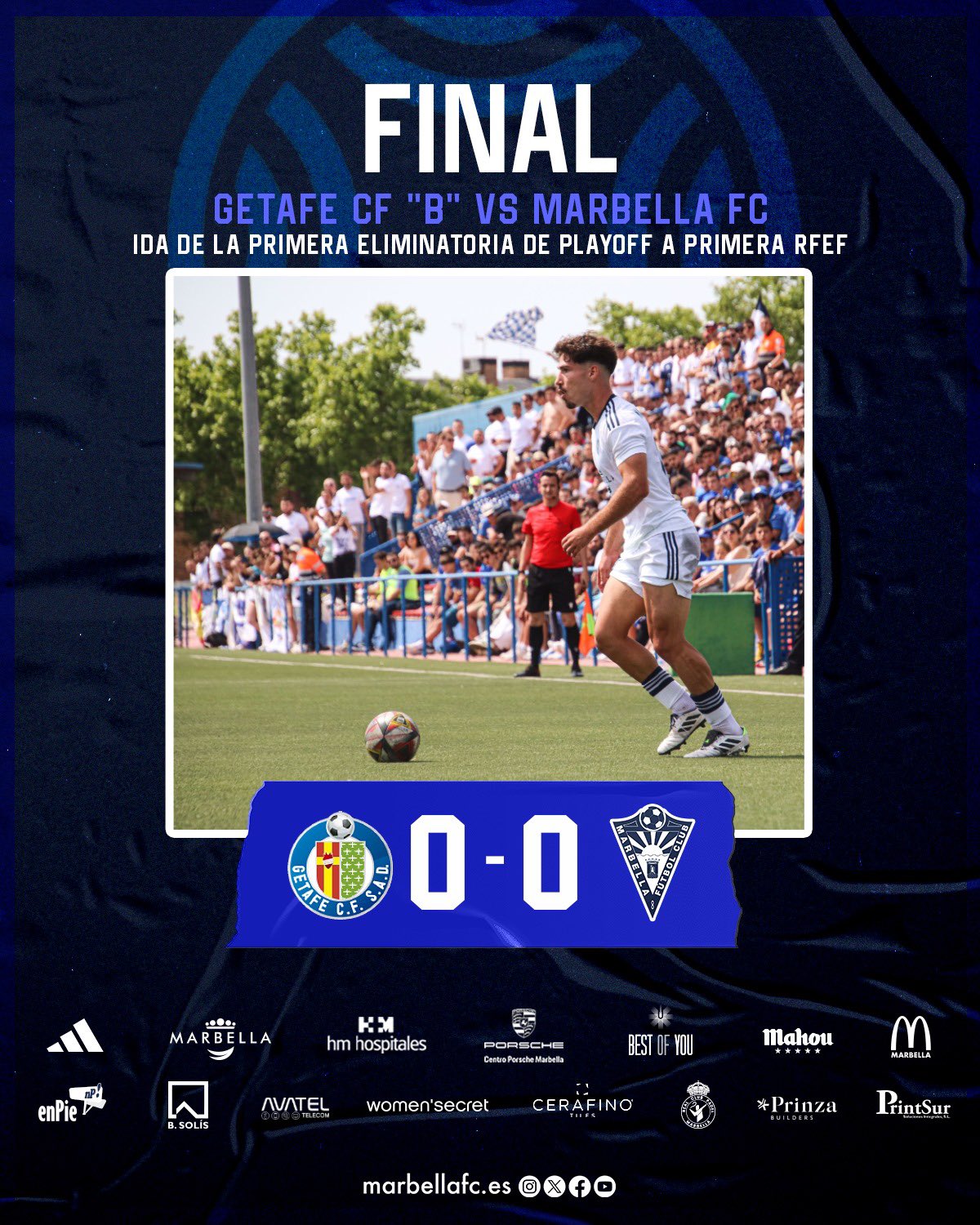 Buen resultado para el Marbella FC en el partido de ida del ascenso a la Primera RFEF. Un empate( 0-0 ) en tierras madrileñas ante el Getafe B. Una mañana muy calurosa en la capital de España y un choque muy táctico y con pocas ocasiones de gol en ambas áreas. A destacar la buena presencia de aficionados blancos en la Ciudad Deportiva de Getafe.