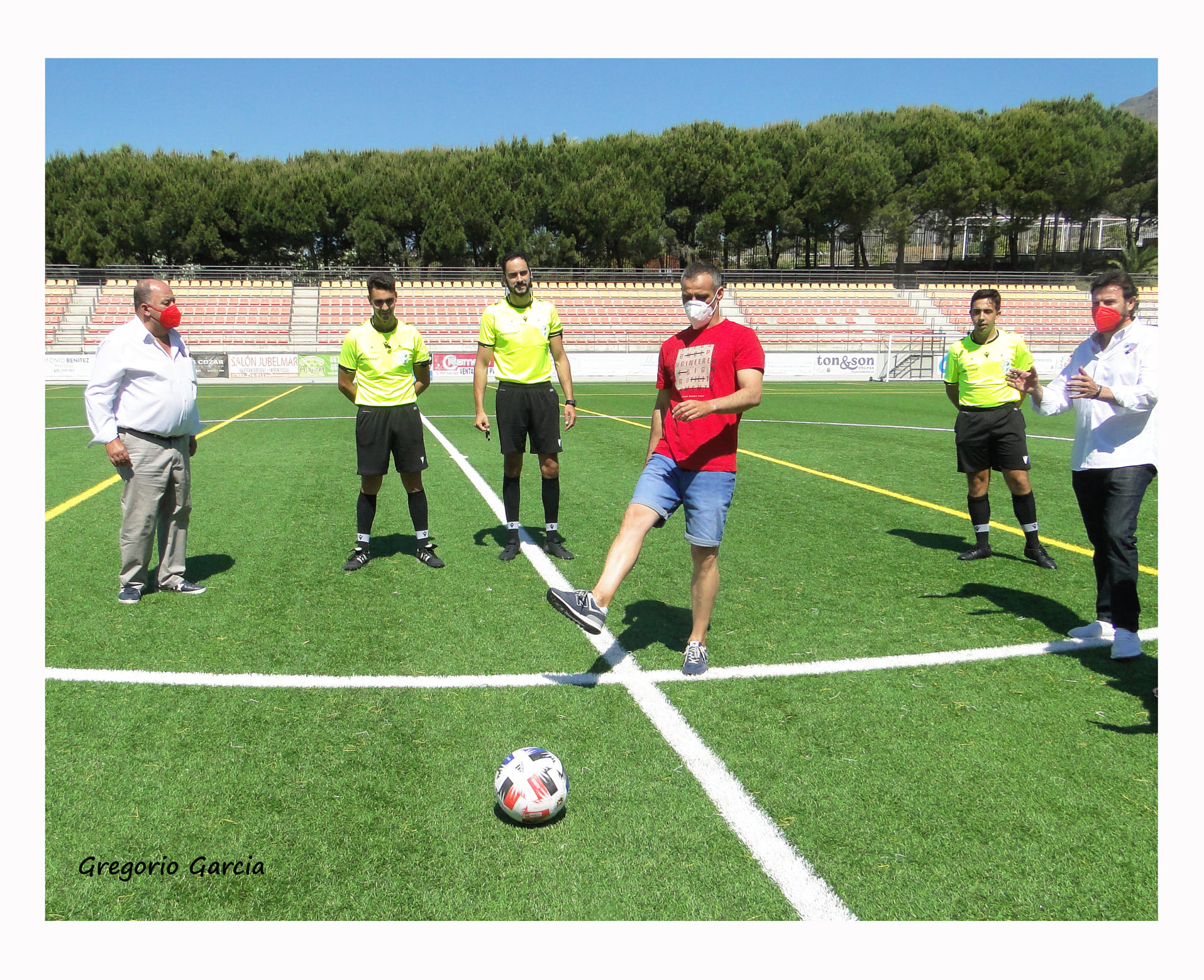 El domingo por la mañana hizo el saque de honor del partido de fútbol entre el CD Estepona y Real Jaén, recibiendo el aplauso de los asistentes al Estadio Muñoz Pérez.