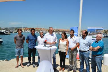 El alcalde de San Roque, Juan Carlos Ruiz Boix, el director del Puerto Sotogrande, Miguel Angel Diez, y el nadador