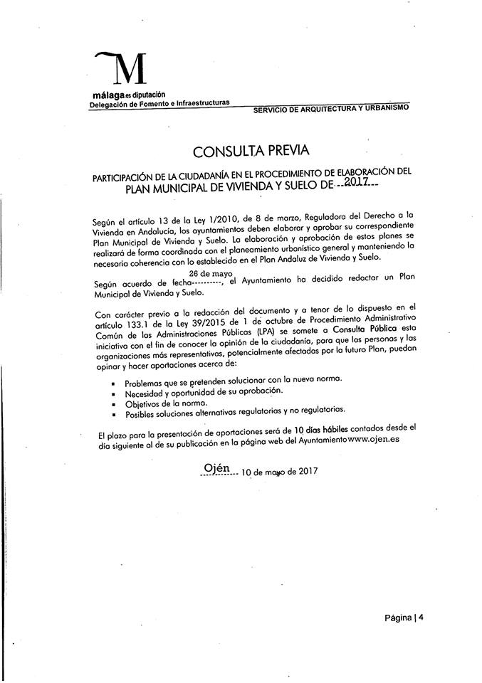 El Ayuntamiento de Ojén anima a la participación ciudadana para proceder a la elaboración del Plan Municipal de Vivienda y