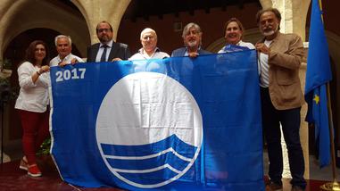Responsables municipales han recogido hoy, lunes, las tres banderas azules correspondientes a las playas de Torreguadiaro y Cala Sardina y