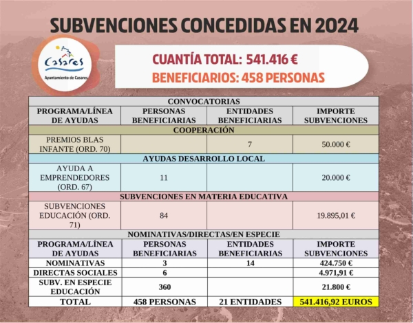 El Plan Estratégico de Subvenciones del Ayuntamiento de Casares hace balance de estos años 2024 en el que se han