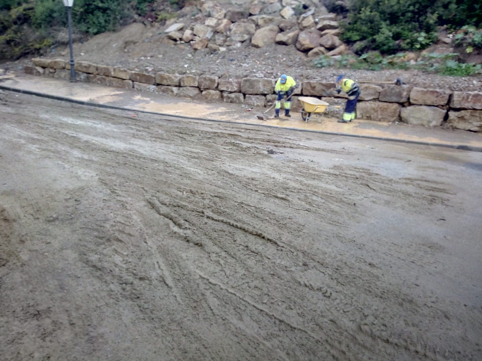 Tras una primera intervención de los trabajadores municipales para retirar el barro y piedras arrastradas por la lluvia a los