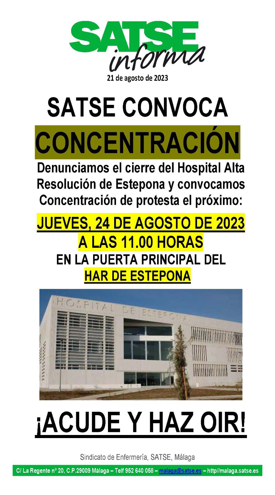 El Sindicato de Enfermería de Málaga, SATSE, ha convocado una concentración para este jueves 24, a las 11 h, en