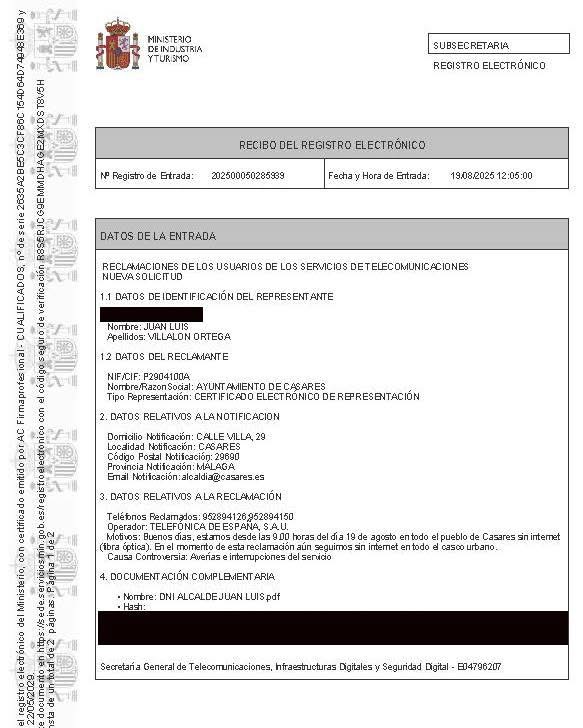 El Ayuntamiento de Casares ha presentado una nueva queja ante el Ministerio para la Transformación Digital y de la Función