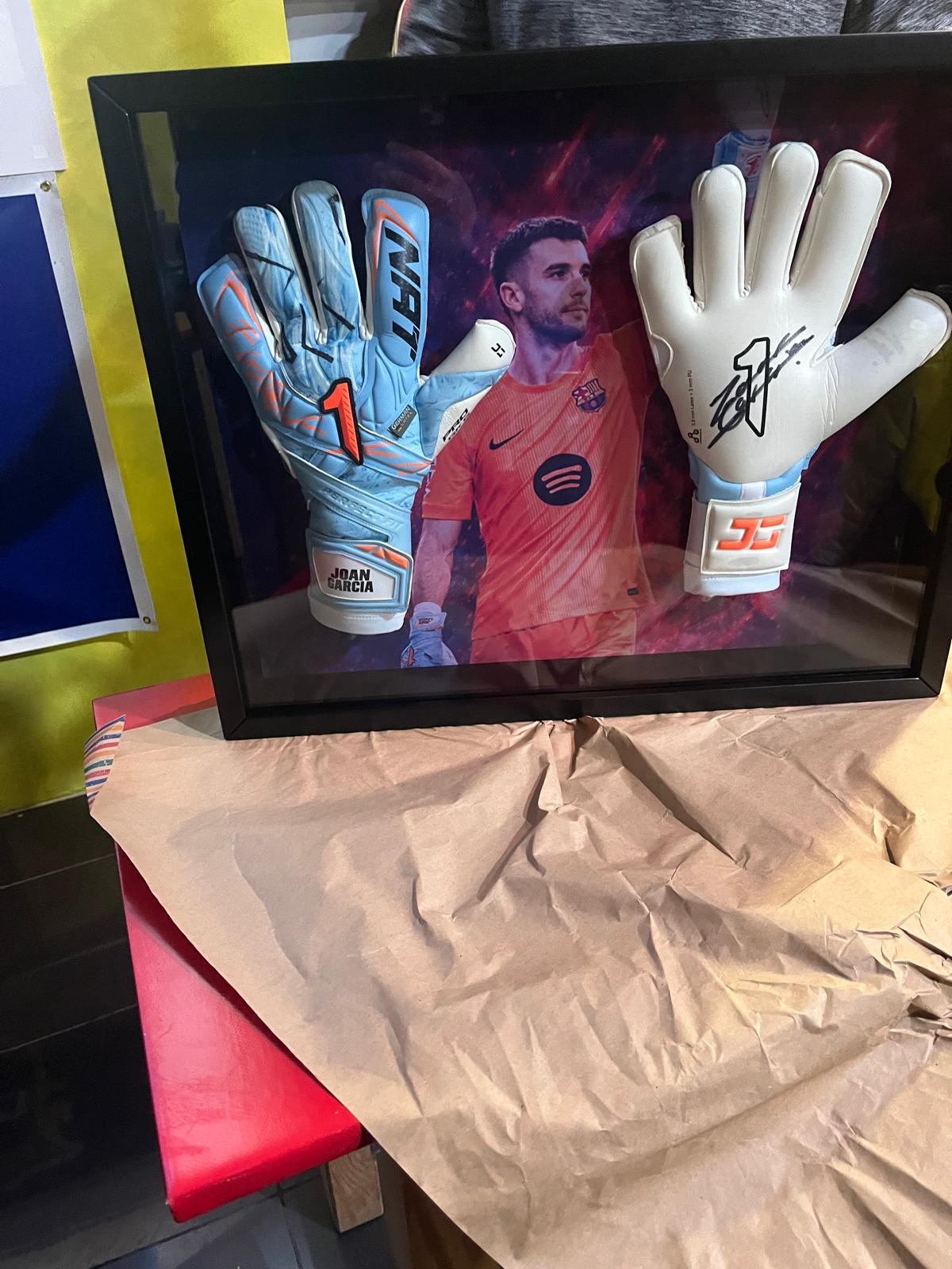 El portero del FC Barcelona, Joan García, regala sus guantes a la PB Estepona por su 29º aniversario