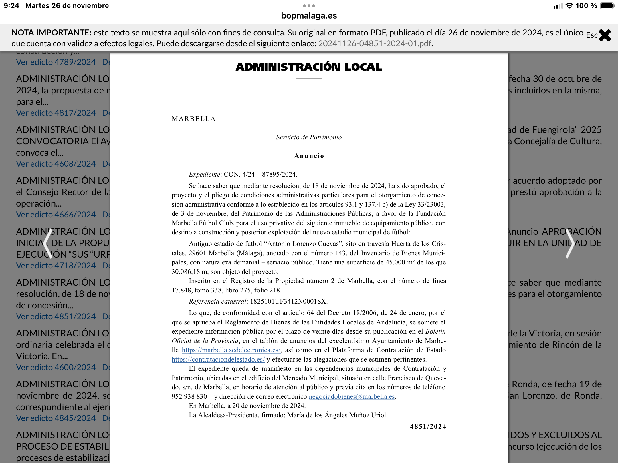 Hoy martes el Boletín Oficial de la Provincia de Málaga (Bopma) publica el inicio del periodo de información pública del