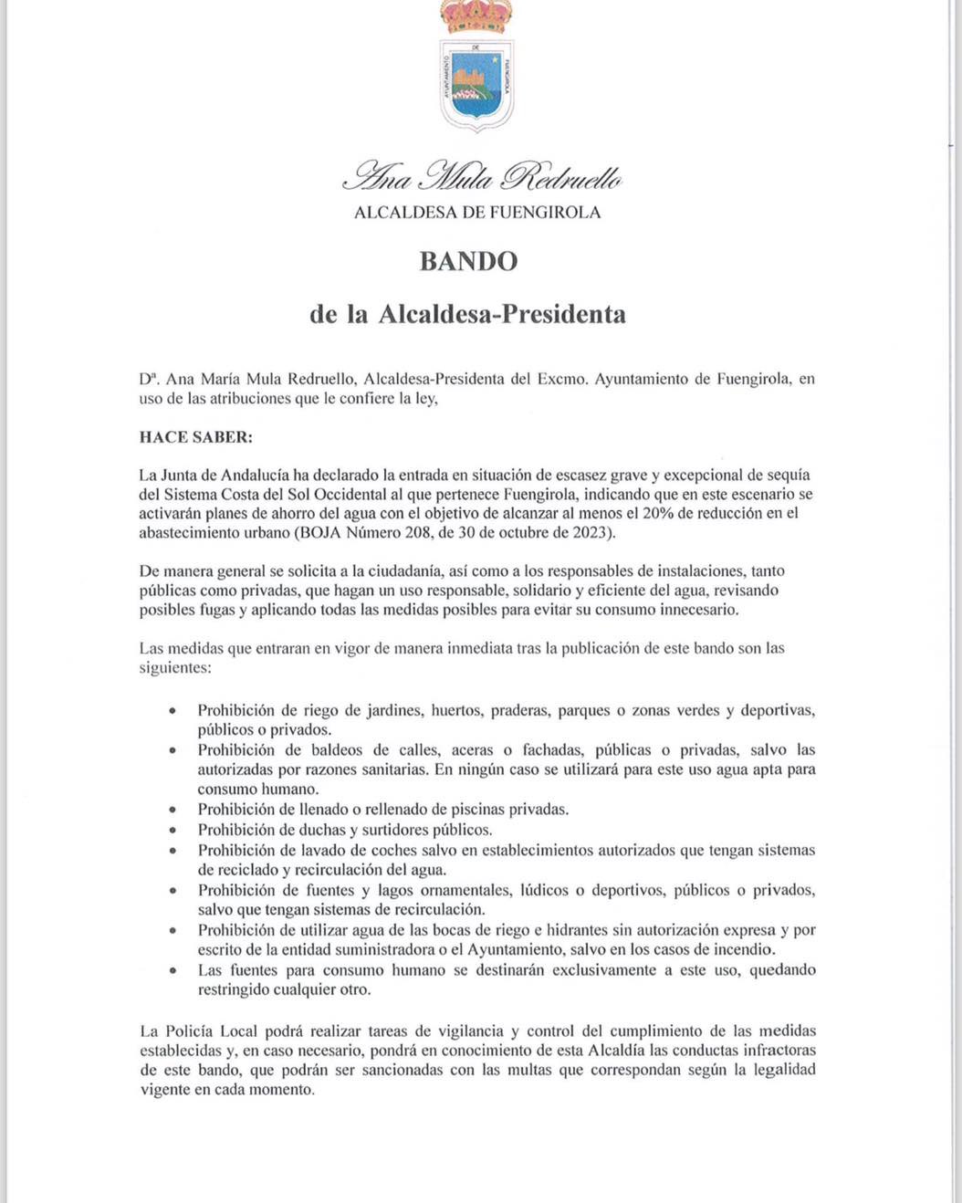 El Ayuntamiento de Fuengirola ha adoptado medidas para reducir el consumo de agua un 20% debido a la sequía. Así