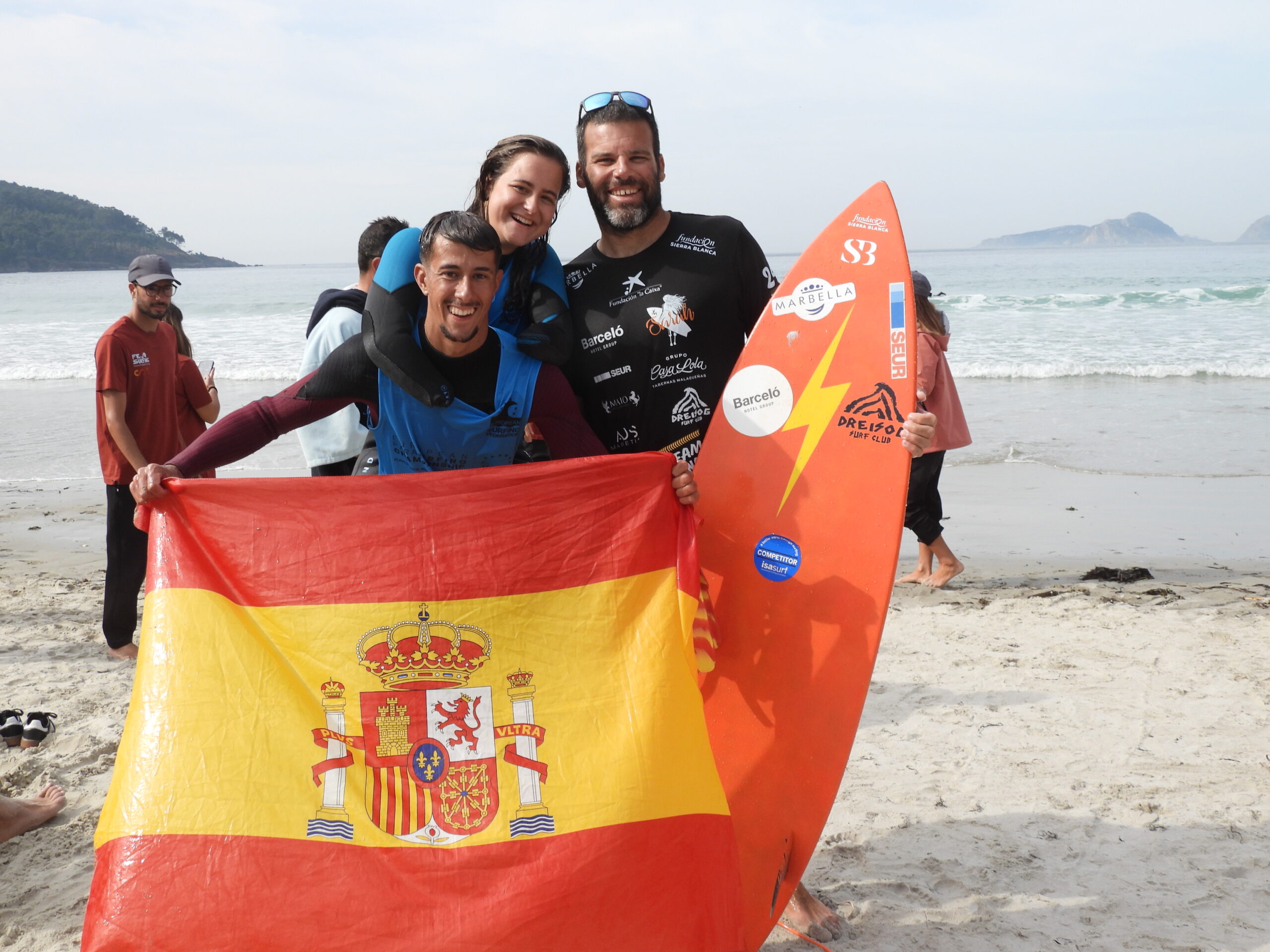 La deportista marbellí Sarah Almagro Vallejo, en equipo con Alejandro Barbosa y Nico Huercano de la escuela de Surf reisog,