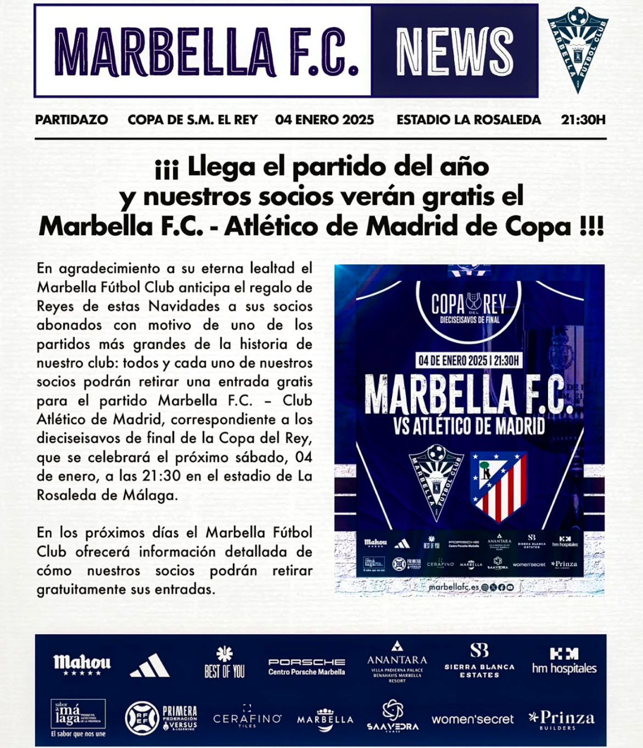¡¡¡Los mejores precios para llenar La Rosaleda con este partidazo de Copa!!!. Así ha anunciado en una nota de prensa