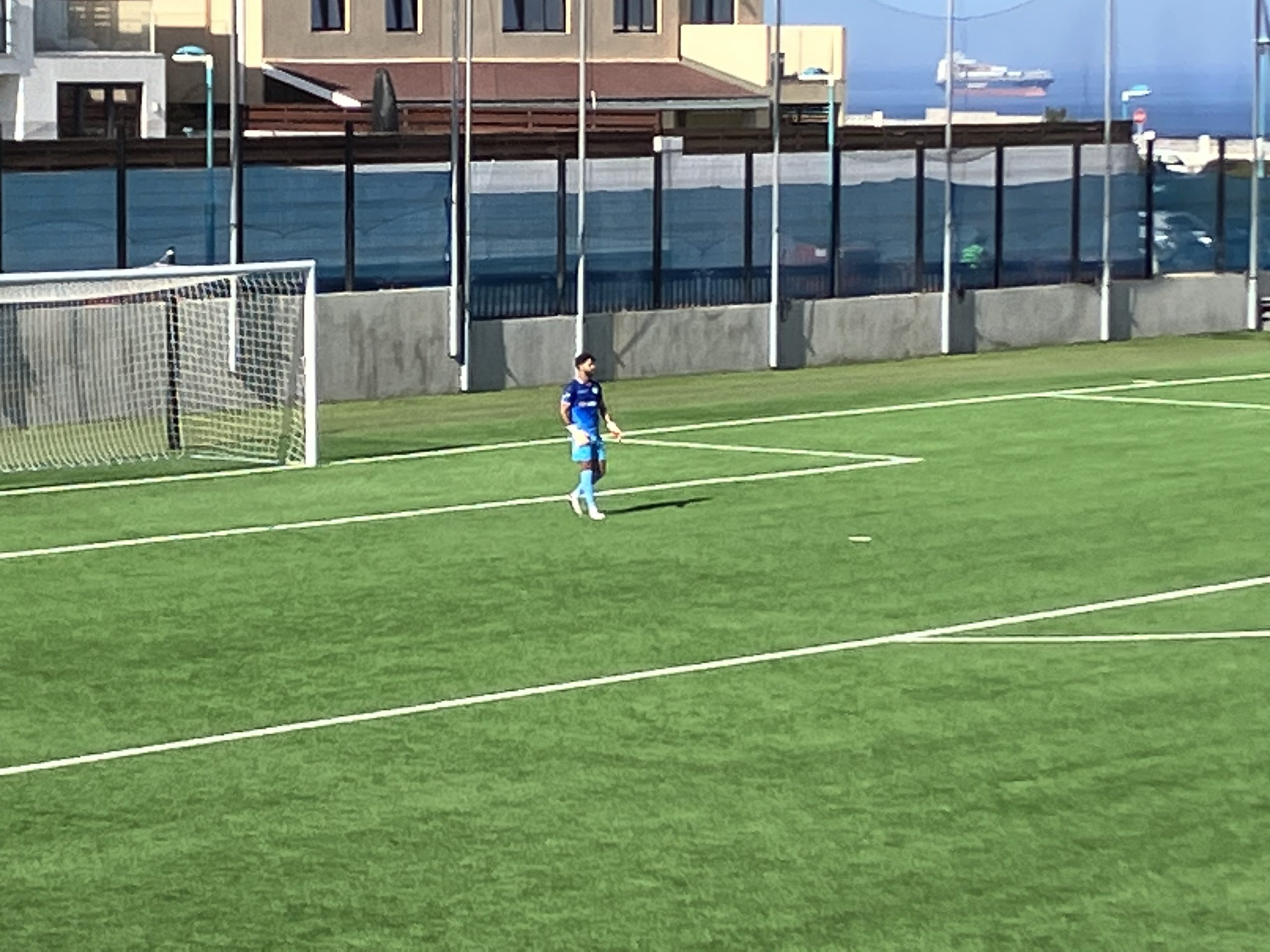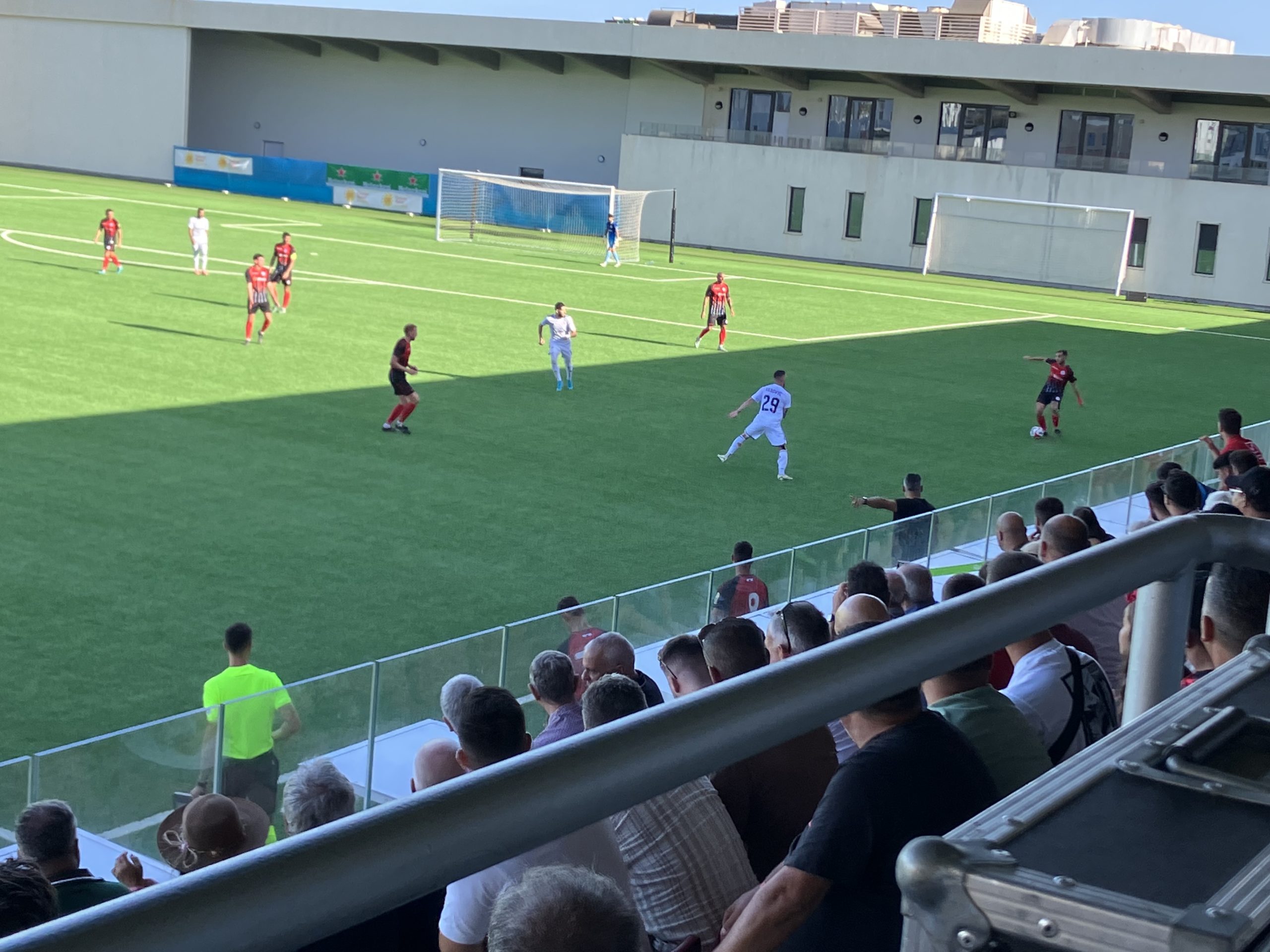 Buen ambiente con casi lleno( aforo de 770 espectadores )en el Europa Point Sports Complex, siempre con viento. Partido de la segunda ronda de la Champions League.