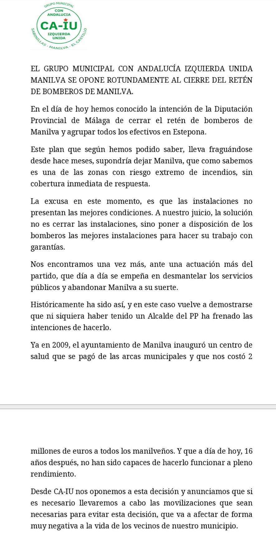 **Por su parte CON ANDALUCIA IU MANILVA ha emitido hoy esta nota: «En el día de hoy hemos conocido la intención de la Diputación Provincial de Málaga de cerrar el retén de bomberos de Manilva y agrupar todos los efectivos en Estepona. Este plan que según hemos podido saber, lleva fraguándose desde hace meses, supondría dejar Manilva, que como sabemos es una de las zonas con riesgo extremo de incendios, sin cobertura inmediata de respuesta.