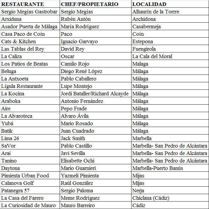 Respeto a los restaurantes de Málaga ya son 26 y la previsión es incrementar la relación en los próximos días. Como gran primicia destaca la incorporación de establecimientos de Cádiz abanderados por la Curiosidad de Mauro, de la capital y La Casa del Farero de Poblado de Sancti Petri.