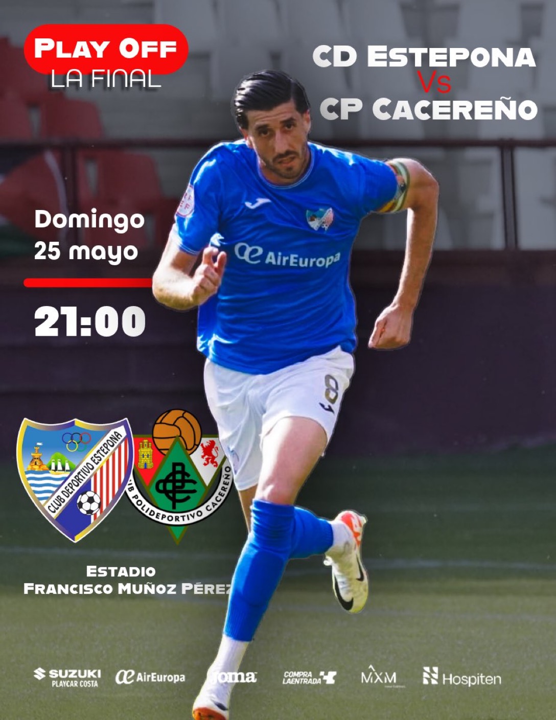 Día histórico para el fútbol de Estepona. Ese domingo( 21 h) el Estadio Muñoz Pérez se llenará( unos 4.000 espectadores ) para vivir el choque de ida de la final por el ascenso a la Primera RFEF. El CD Estepona se enfrentará al CP Cacereño. El quinto clasificado del Grupo IV contra el segundo del Grupo V.