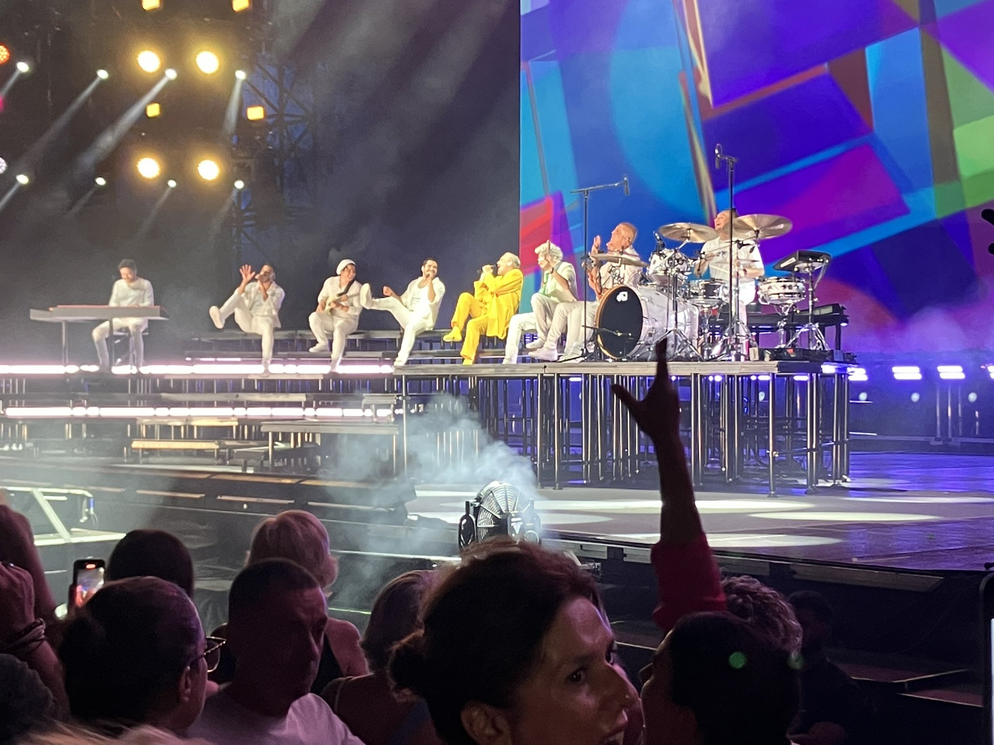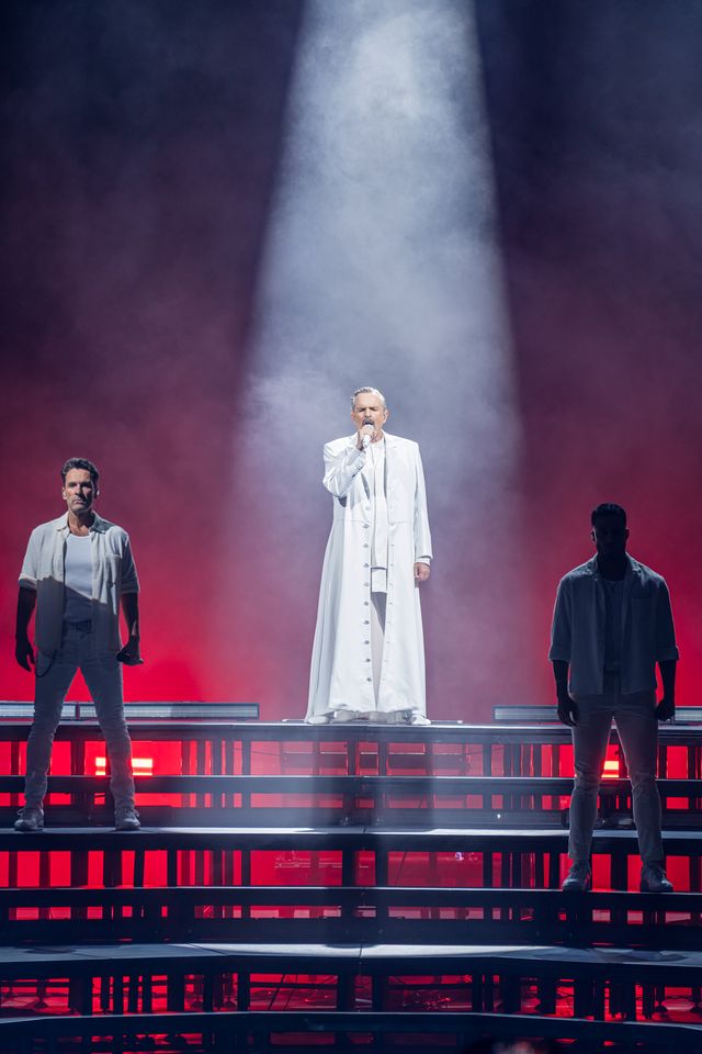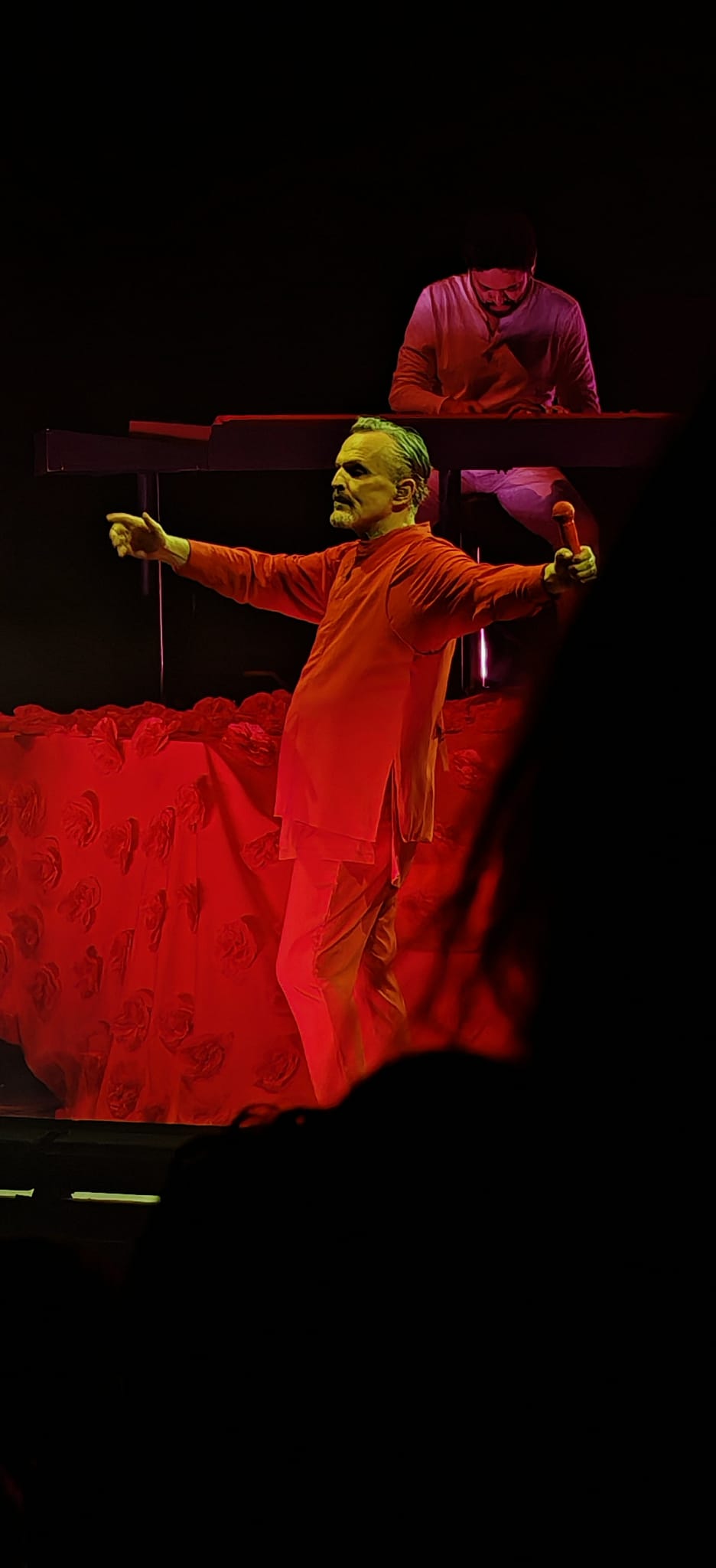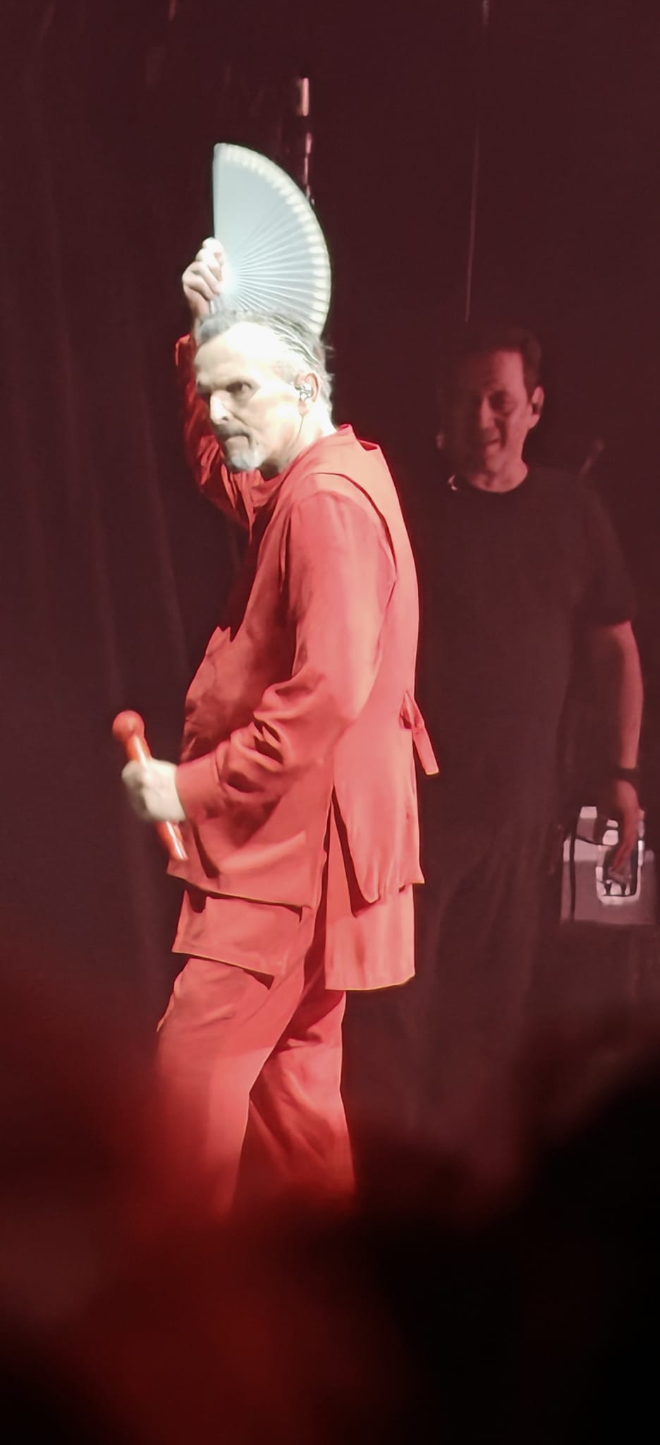 La noche comenzó con ‘Mirarte’, dando paso a un repertorio que recorrió desde ‘Nena’ y ‘Bambú’ hasta ‘Nada particular’ o ‘Te amaré’. Acompañado de su banda vestida completamente de blanco, con una escenografía minimalista y simbólica, Bosé fue cambiando de atuendo según avanzaba el show: blanco, rojo y amarillo, como parte de una narrativa visual que acompañaba cada bloque emocional del concierto.
