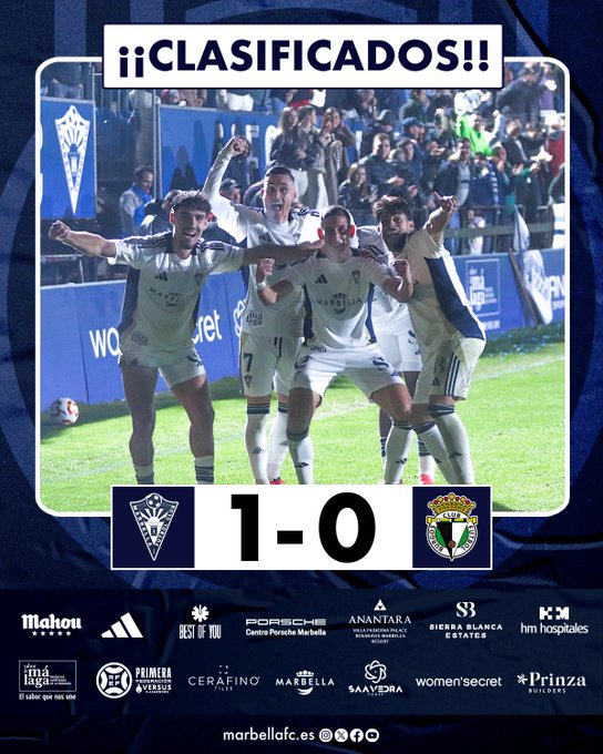 Día histórico para el Marbella FC. El club blanquillo ha derrotado con merecimiento( 1-0 ) a un club de Segunda división como el Burgos CF y pasa a la tercera de la Copa del Rey. Tendrá un rival de Primera división en las fechas cercanas a los Reyes Magos. Todo un regalo para los fieles aficionados que se conocerá este lunes en el sorteo de la RFEF.