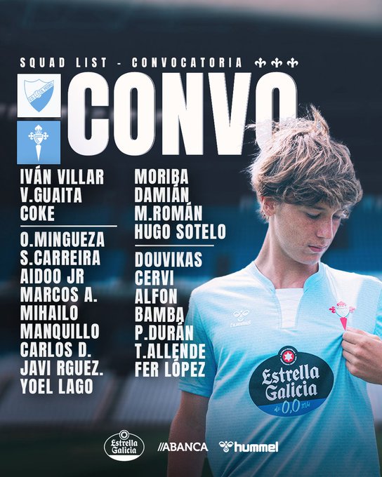 El RC Celta llega con bajas a la Costa del Sol. El entrenador, Claudio Giráldez, contará con un equipo con muchos cambios. No estarámn Iago Aspas, Borja Iglesias, Starfelt, Hugo Álvarez y Swedberg. Esta es la lista de jugadores expedicionarios: Iván Villar (1), Vicente Guaita (13), Coke (35), Óscar Mingueza (3), Sergio Carreira (5), Ilaix Moriba (6), Tasos Douvikas (9), Franco Cervi (11), Alfon (12), Joseph Aidoo (15), Jonathan Bamba (17), Pablo Durán (18), Marcos Alonso (20), Mihailo Ristic (21), Javier Manquillo (22), Tadeo Allende (23), Carlos Domínguez (24), Damián Rodríguez (25), Fer López (28), Yoel Lago (29), Javi Rodríguez (32), Hugo Sotelo (33) y Miguel Román (34). Es decir, hasta tres futbolistas del filial.