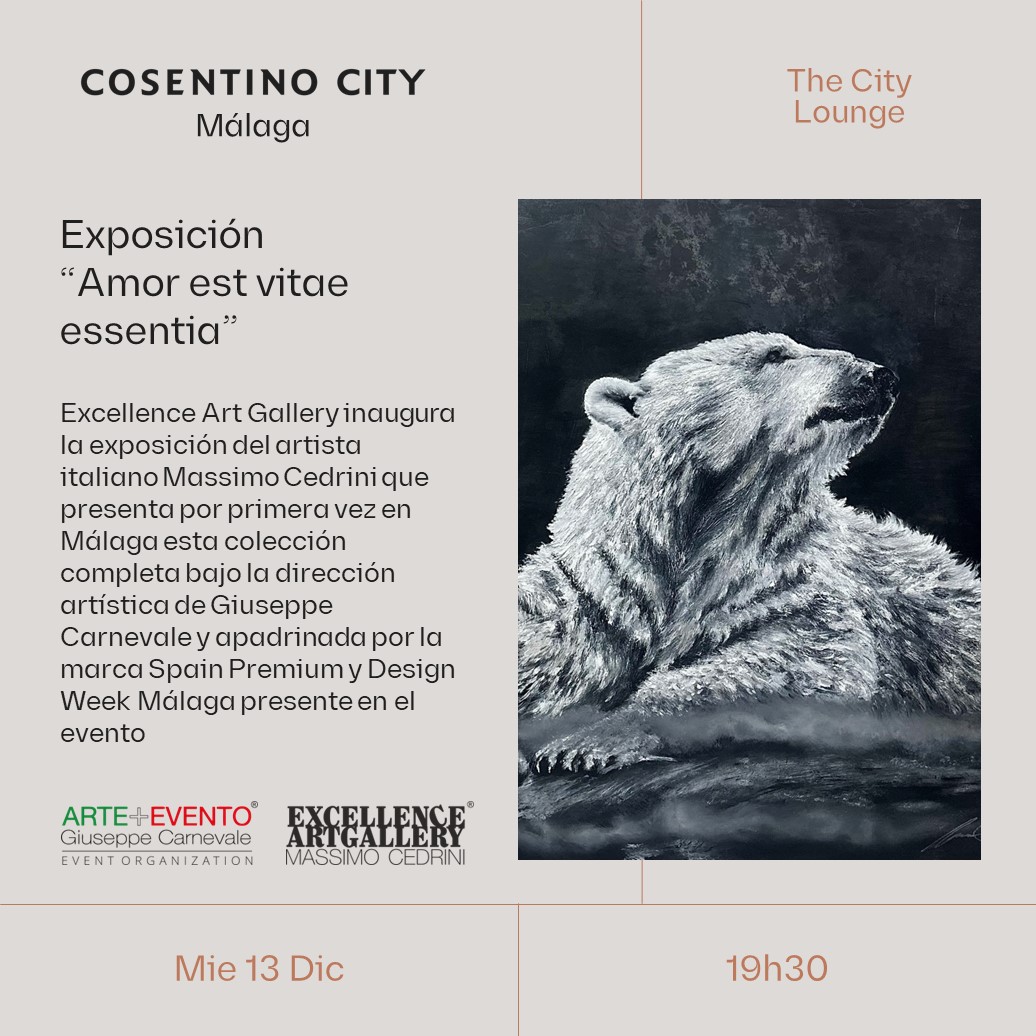 Las instalaciones de la marca Cosentino City Malaga acogerán el día 13 de diciembre la exposición titulada “Amor Est Vitae Essentia” con inauguración fijada a las 19:30 hs. Se trata de una veintena de obras del artista italiano Massimo Cedrini presentada por la galería Excellence Art Gallery de Marbella. La muestra cuenta con la dirección artística de Giuseppe Carnevale y en ella el artista presenta una serie de cuadros inéditos que pretenden provocar una profunda reflexión acerca del maltrato hacia el mundo animal por parte del ser humano y, al mismo tiempo, enfocada en concientizar al público a favor de una mayor sensibilidad y respeto del medio ambiente.