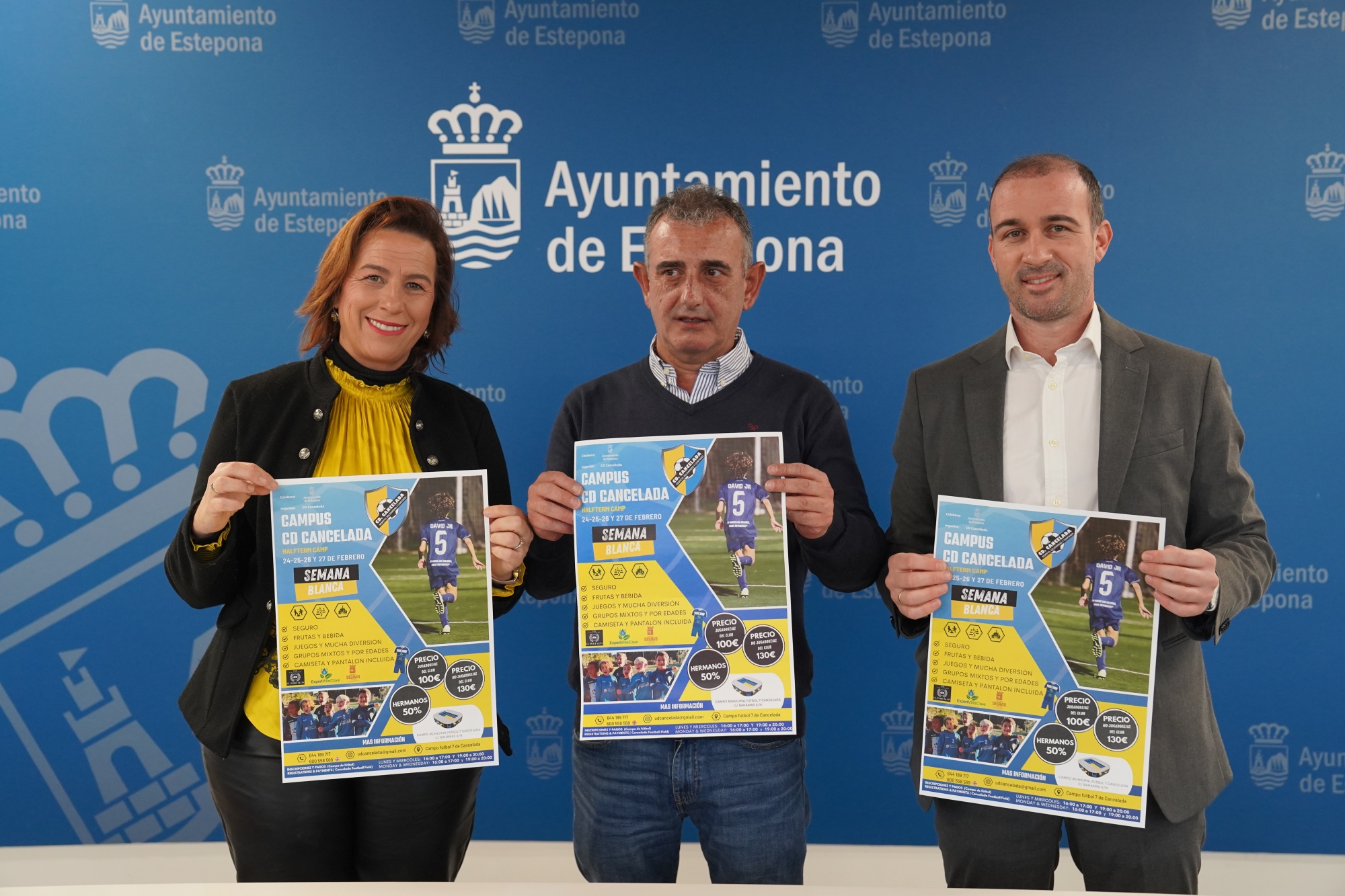 La teniente alcalde del área de Extrarradio del Ayuntamiento de Estepona, Begoña Ortiz; el concejal adscrito a la delegación de Deporte, Luis Gil; y el vicepresidente del CD Cancelada, José Antonio Vílchez, han presentado hoy el Campus de Fútbol C.D Cancelada Semana Blanca que se desarrollará del 24 al 27 de febrero en el campo de fútbol de este núcleo de población.