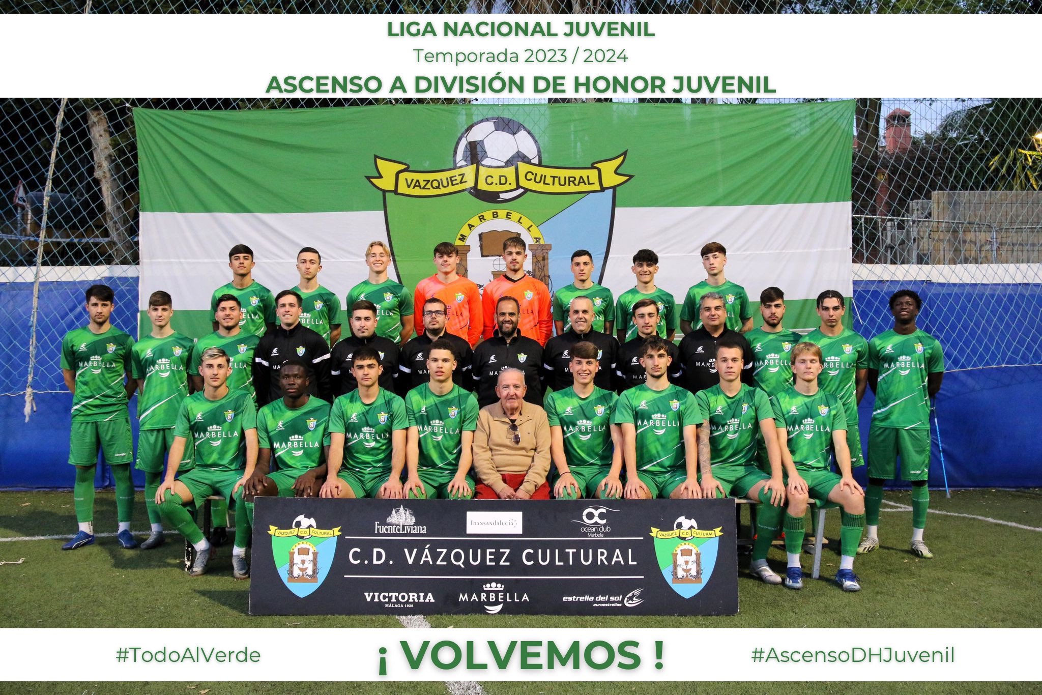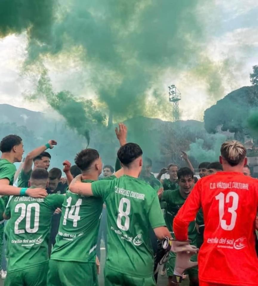 Se cumplieron los pronósticos y ganando a lo grande( 4-0 ) al Puerro Malagueño ya es matemáticamente club de la División de Honor de juveniles el CD VAZQUEZ CULTURAL. Los Verdes de Marbella retornan a la élite del fútbol español tras una temporada en la Liga Nacional de Juveniles. Con 3 jornadas por jugar los marbellíes suman 60 puntos y el CD La Mosca tiene 48, por lo cual no lo puede alcanzar en la tabla.