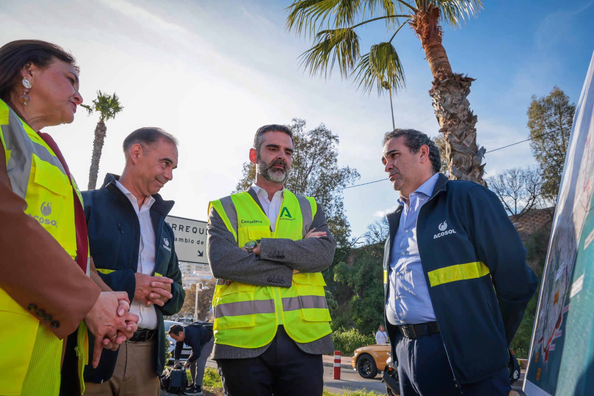 El consejero ha estado acompañado por el alcalde de Benalmádena, Juan Antonio Lara; la alcaldesa de Torremolinos, Margarita del Cid; el presidente de la Mancomunidad de la Costa del Sol Occidental, Manuel Cardeña; y la consejera delegada de Acosol, Matilde Mancha, además de los técnicos responsables de dicha actuación tanto de Acosol como de la empresa adjudicataria de las mismas.