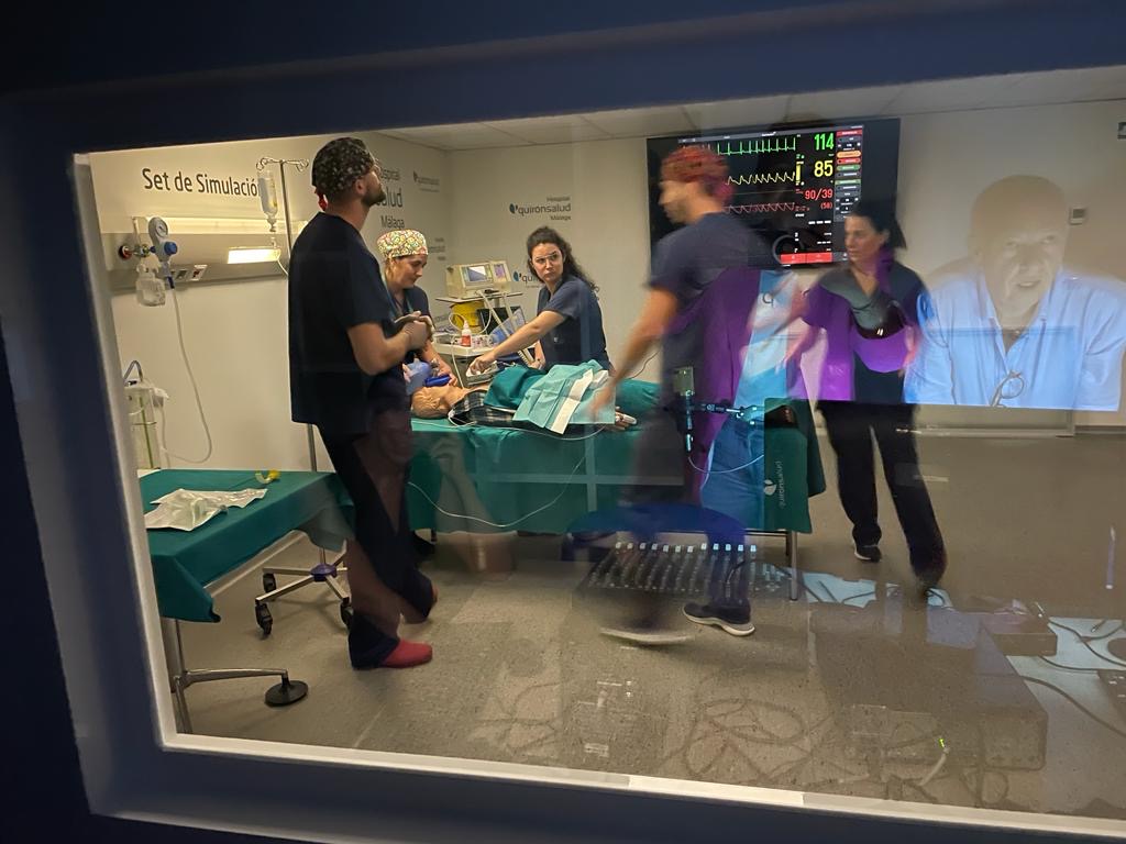 El Servicio de Anestesiología y Reanimación de Quirónsalud Málaga se sumerge en un simulador de situaciones críticas en la innovadora sala de formación y simulación con la que cuenta el centro hospitalario. Así, el equipo de anestesistas del Hospital, encabezado por los doctores Ignacio Marín y Alfonso Navas, se ha formado en casos críticos, como el shock anafiláctico o anafilaxia, el neumotórax en postoperatorio o el síndrome de implantación de cemento químico en cirugía de reemplazo de cadera.