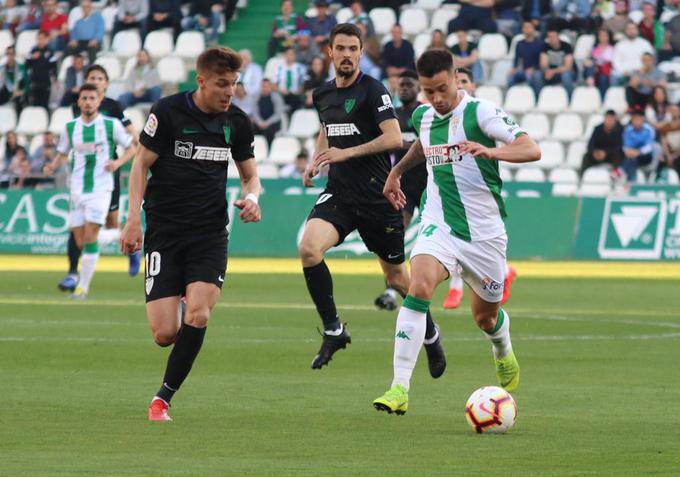 El once de Muñiz presentó dos novedades. El técnico malaguista introdujo en la alineación titular a Luis Hernández por el sancionado Diego González y a Harper por el lesionado Dani Pacheco. A los ocho minutos, Adrián González tuvo que ser sustituido por Erik Morán debido a unos problemas físicos. Un minuto después, llegó la primera ocasión del partido para el cuadro visitante. Keidi empaló un buen disparo desde la frontal. El balón se marchó por encima de la portería defendía por Carlos Abad. El Málaga seguía llegando con peligro al área cordobesista. Buena internada de Iván Alejo por banda derecha. Su centro fue desviado a córner por la zaga local. En el ecuador de la primera mitad (22’), Erik Morán vio la primera cartulina amarilla del partido por una falta en el medio del campo. Diez minutos después, fue el defensa del Córdoba Luis Muñoz quien fue amonestado por derribar a Blanco Leschuk. Ricca probó suerte con un disparo lejano a la caída de un rechace, pero el balón se marchó a la izquierda de la portería. El conjunto entrenado por Muñiz dominó la primera mitad, pero no consiguió anotar a pesar de las sucesivas acometidas.