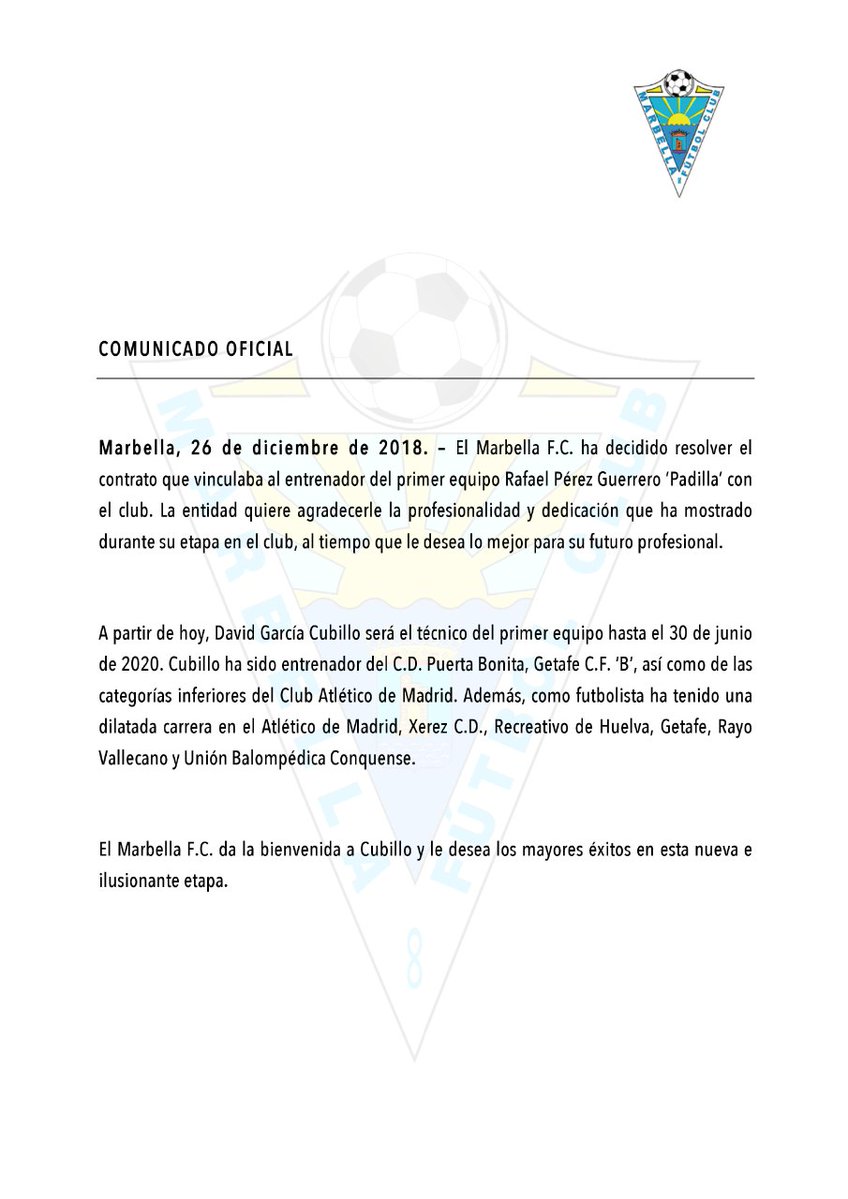 En un comunicado de prensa oficial breve en las RRSS, el Marbella FC ha anunciado la destitución del entrenador Rafael Pérez Padilla. Después de los últimos malos resultados se ha tomado esta medida, siendo su sustituto David García Cubillo. En la nota se indica la resolución del contrato del técnico malagueño «al que se ole agradece su profesionalidad y dedicación que ha mostrado durante su etapa en el club, al tiempo que le desea lo mejor para su futuro profesional».