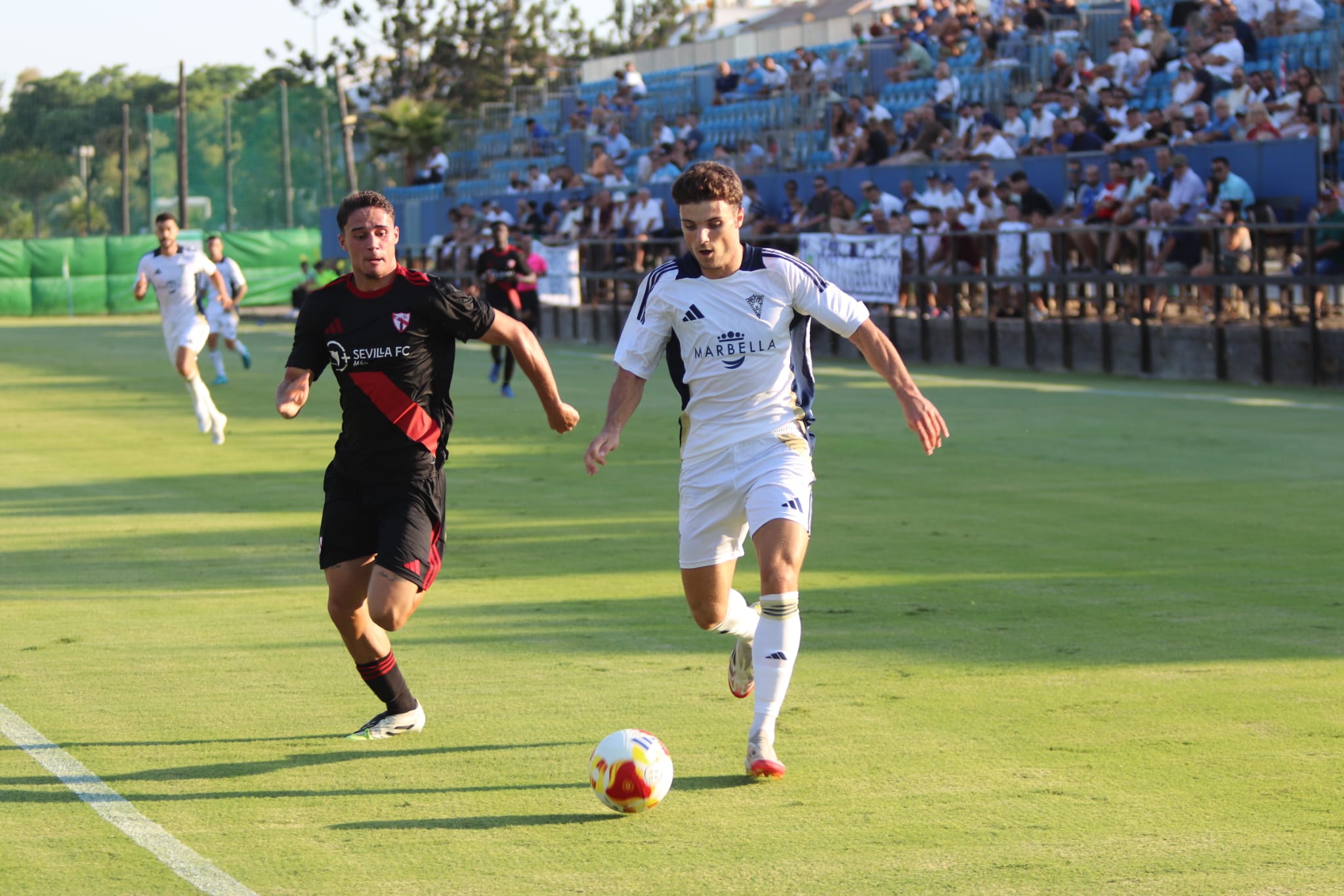 En la primera mitad se adelantó pronto( minuto 11 ) el Sevilla Atlético. Fue igualado este período. En la segunda parte con los cambios en los locales las cosas funcionaron bien y el Marbella fue dominador del choque. Pronto llegaron las ocasiones de gol, pero hasta los 67´ no llegó el empate con un buen disparo de Luis Alcalde desde fuera del área a los 67´. El Sevilla Atlético pudo recibir más goles en su portería. El gol de la remontada lo anotó Alex Toper en el minuto 74, aprovechando un error del portero sevillano. Y se cerró el encuentro con la victoria pòr la mínima. El próximo y último amistoso será este viernes, en Jerez de la Frontera, ante el Recreativo de Huelva.