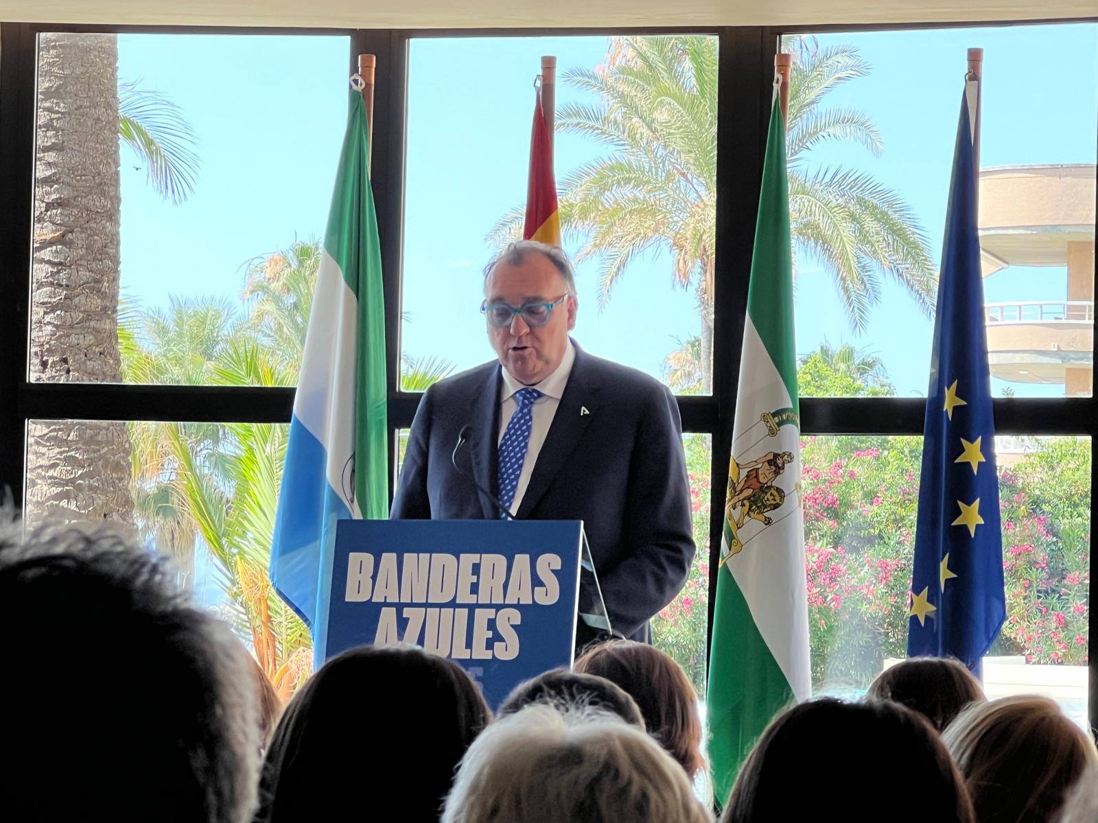 El teniente de alcalde delegado de Medio Ambiente y Playas, Juan Serván, ha sido el encargado de recogerlas en nombre del Ayuntamiento de San Roque, en el acto de entrega de las banderas azules correspondientes a la provincia gaditana que se ha desarrollado este viernes en Torremolinos.