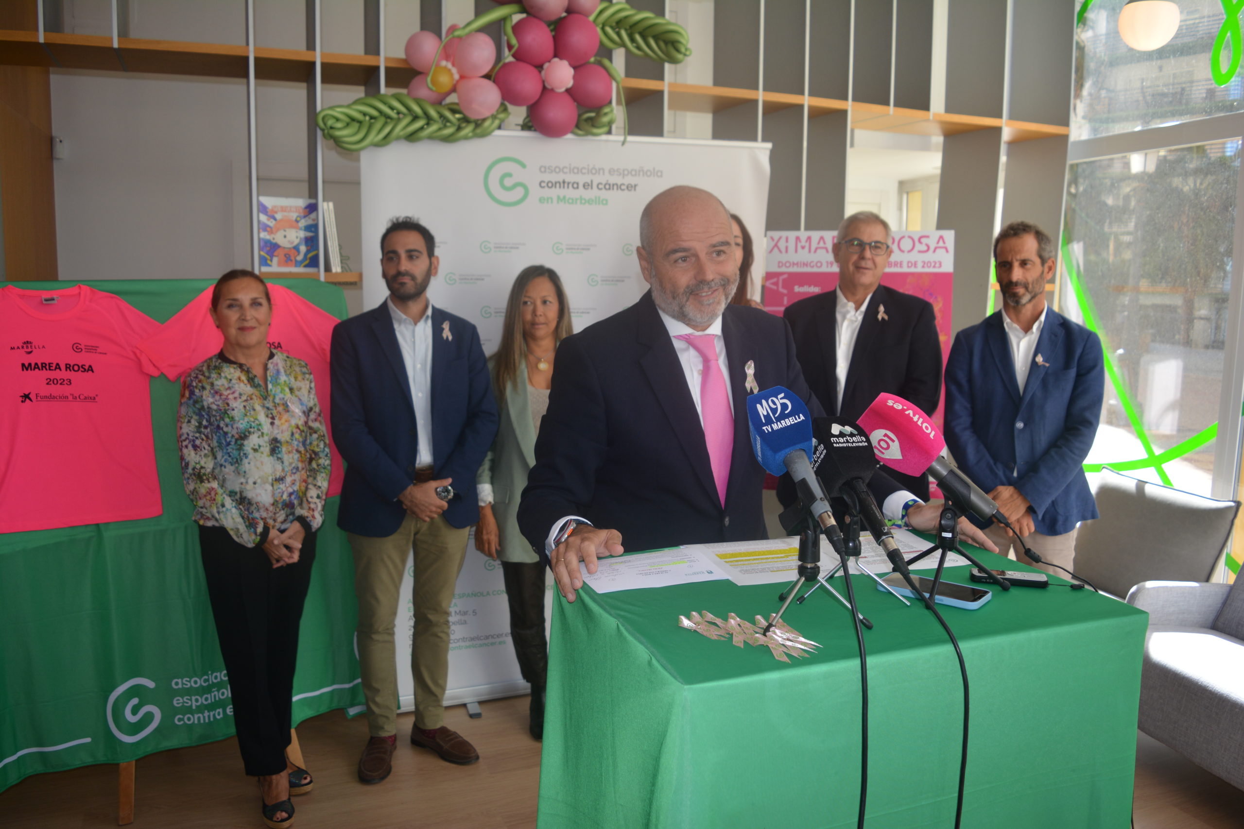 El presidente de la Asociación Española Contra el Cáncer en Marbella, Santiago Gómez-Villares, Lisandro Vieytes, delegado de Deportes, Sanidad, Consumo y Servicios e Isabel Cintado, delegada de derechos Sociales, Igualdad y Diversidad del Ayuntamiento de Marbella, Carmen González Novo, directora del área de negocio de CaixaBank en Marbella-Costa del Sol y Miguel Molina (Joyería Gómez&Molina) han presentado esta mañana una nueva edición de la Carrera “Marea Rosa”, que se va a disputar el domingo 19 de noviembre a beneficio de la lucha contra el cáncer de mama. Por parte de la asociación acompañaban al presidente Setareh Mohregui, vicepresidenta, María Matías, vocal de eventos y Francisco Eduardo Sánchez, vocal de misión de la sede de Marbella.