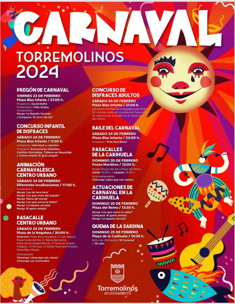 Aproximadamente a las 14:30, en la Playa de La Carihuela, entre los chiringuitos ‘El Canarias’ y ‘El Lele’, se llevará a cabo la quema de la sardina, acto que pondrá el broche de oro al Carnaval de Torremolinos.