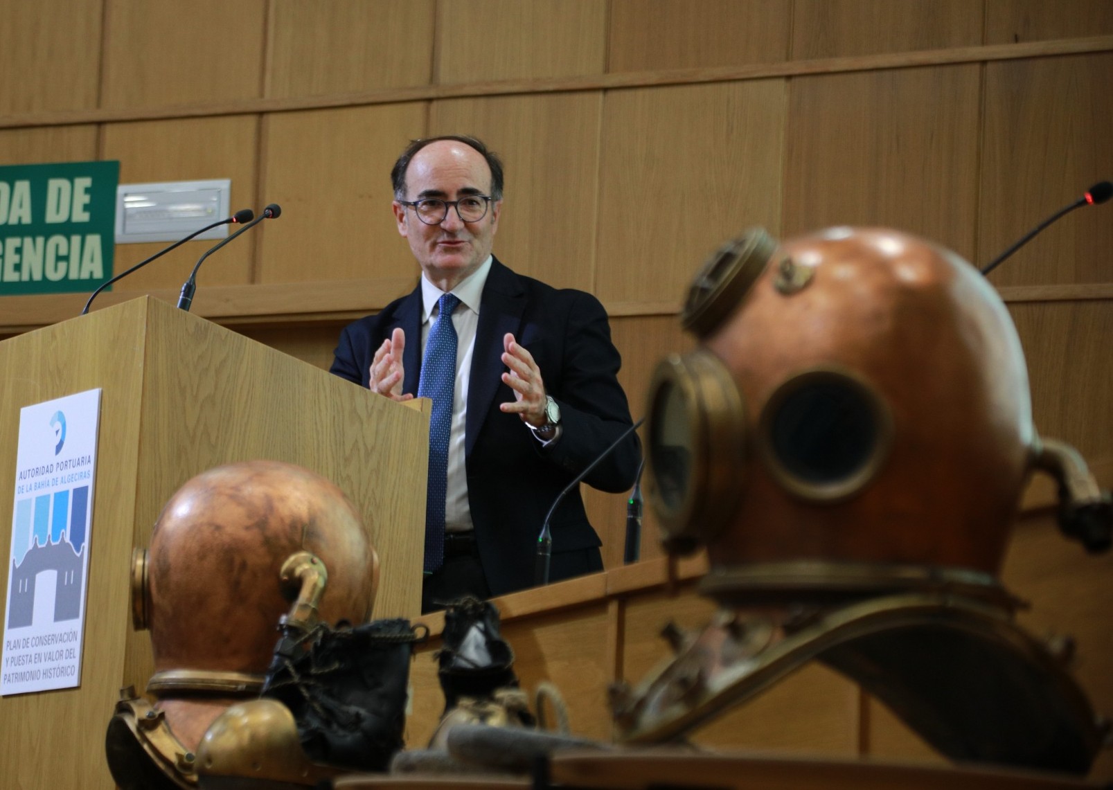 El Puerto de Algeciras recuperó anoche un pedacito de su historia gracias a lo que nos cuentan hallazgos como la escafandra (zapatos, casco, traje y escapulario) centenaria que ha restaurado el Instituto Andaluz de Patrimonio Histórico (IAPH) y que ayer fue presentado en sociedad. El traje, hallado aplastado hace algunos años en antiguas dependencias de la Autoridad Portuaria, tendrá como destino el futuro Museo y Centro de Interpretación del puerto del Lago Marítimo, en los terrenos portuarios del Llano Amarillo, en Algeciras. Como explicó el presidente de la Autoridad Portuaria de Algeciras (APBA), Gerardo Landaluce, la iniciativa se engloba en el Plan de Conservación y Puesta en Valor del Patrimonio Histórico de la institución. Dicho plan pivota sobre la rehabilitación de bienes inmuebles como el Fuerte de la Isla Verde o los faros de Camarinal, Carbonera o la Isla de Tarifa, pero también contiene más de 400 elementos muebles. Landaluce adelantó que muchos de ellos formarán parte de la exposición del citado Museo. “Con este tipo de iniciativas el objetivo de la APBA es conservar, recuperar y poner en valor dándolo a conocer el legado histórico y patrimonial que ha llegado hasta nuestros días, misión en la que la institución portuaria lleva invertidos casi 3 millones de euros en los últimos 3 años”, comentó el presidente.