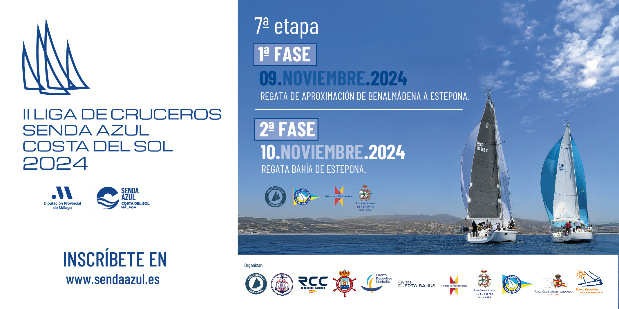El Puerto Deportivo de Estepona y el Real Club Náutico de Estepona serán sede de la 7ª prueba de la II Liga de Cruceros Senda Azul-Costa del Sol que se celebrará los días 9 y 10 de noviembre. El calendario de esta segunda edición comprende un total de 7 pruebas que se están celebrando desde el mes de enero en diferentes puertos deportivos y clubes náuticos de la provincia de Málaga.