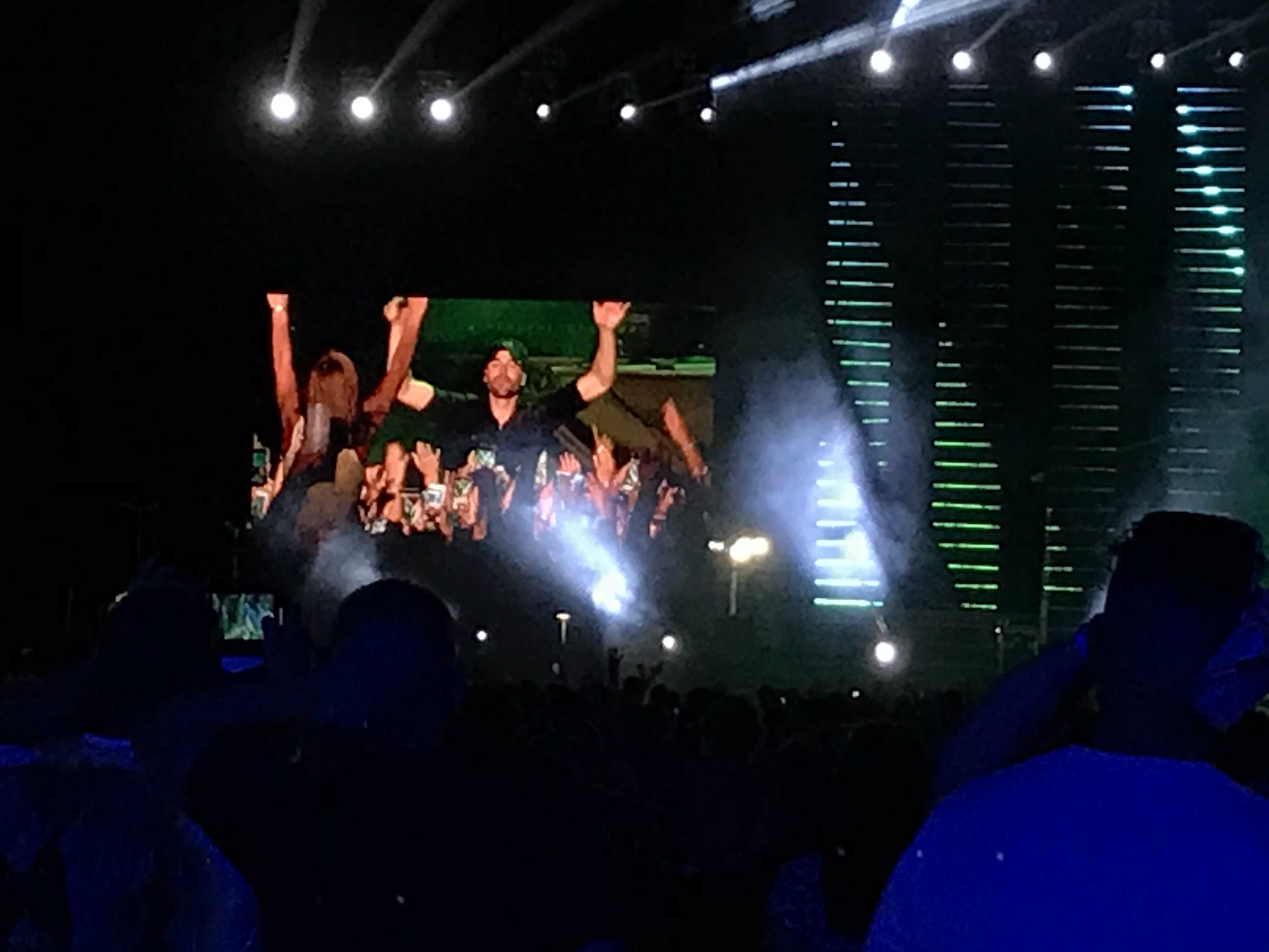 Y llegó la hora del esperado Enrique Iglesias. Vestido de negro y con su inseparable gorra( al final terminó con una camiseta blanca). Enseguida conectó con el público. Dio un repaso a lo más destacado de su discografía, aunque el viento generó algunos problemas en el sonido y especialmente en su pinganillo de control para oir la música. En total 16 canciones, 13 en inglés y 3 en español. Una hora y cuarto de show. «¿Queréis más canciones en español o e inglés»? preguntó el artista. Hecha la votación a mano alzada ganó la segunda opción. Lógico. Se acercó al máximo a los fans y lo intentó todo por agradar. Hay que destacar su voluntad de seguir después de la primera hora y el intento de mejorar el sonido, imposible por el tema de las condiciones climatológicas. El lo explicó y sus bises( hasta 4 canciones) los realizó de modo acústico. El cierre con «Bailando» dio un gran colofón a la primera jornada del Festival