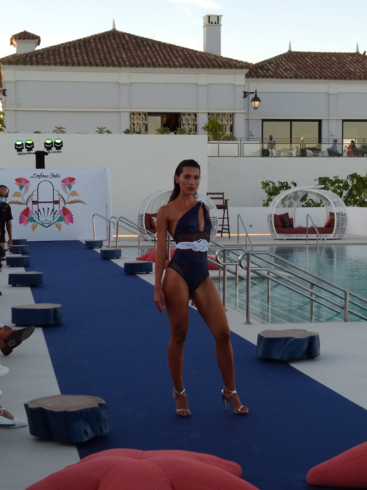 La colección de Dolores Cortés ofrece una imagen de línea joven pero basada en los años 30 con un estilo valenciano tal como indicó su autora. Diez modelos pisaron la improvisada pasarela montada en uno de los laterales de la piscina del complejo turístico.