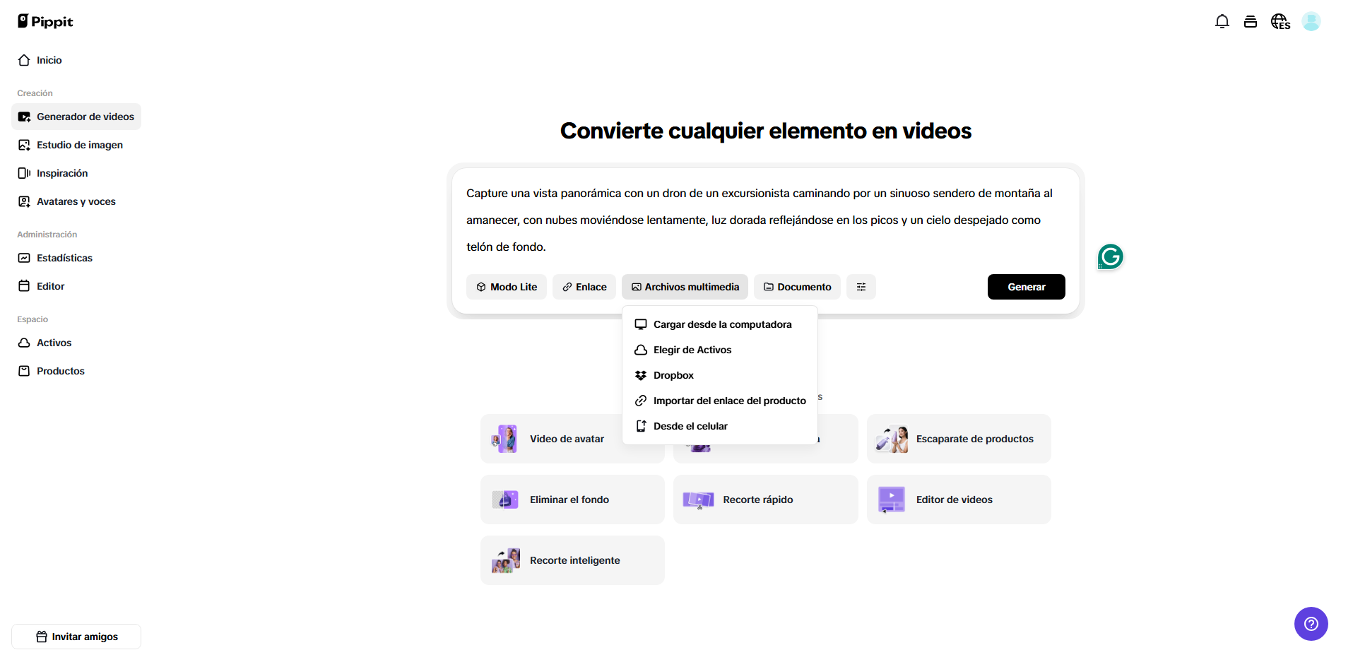 Primero, accede al creador de videos con IA y regístrate. Navega a la pestaña «Generador de videos» y sube tu imagen movida. Puedes agregar medios de referencia si es necesario, seleccionando «Agrega multimedia» y eligiendo desde tu dispositivo local, teléfono, Dropbox o incluso un enlace. Si no tienes medios de referencia, puedes elegir entre los recursos disponibles. Una vez listo, haz clic en «Generar».
