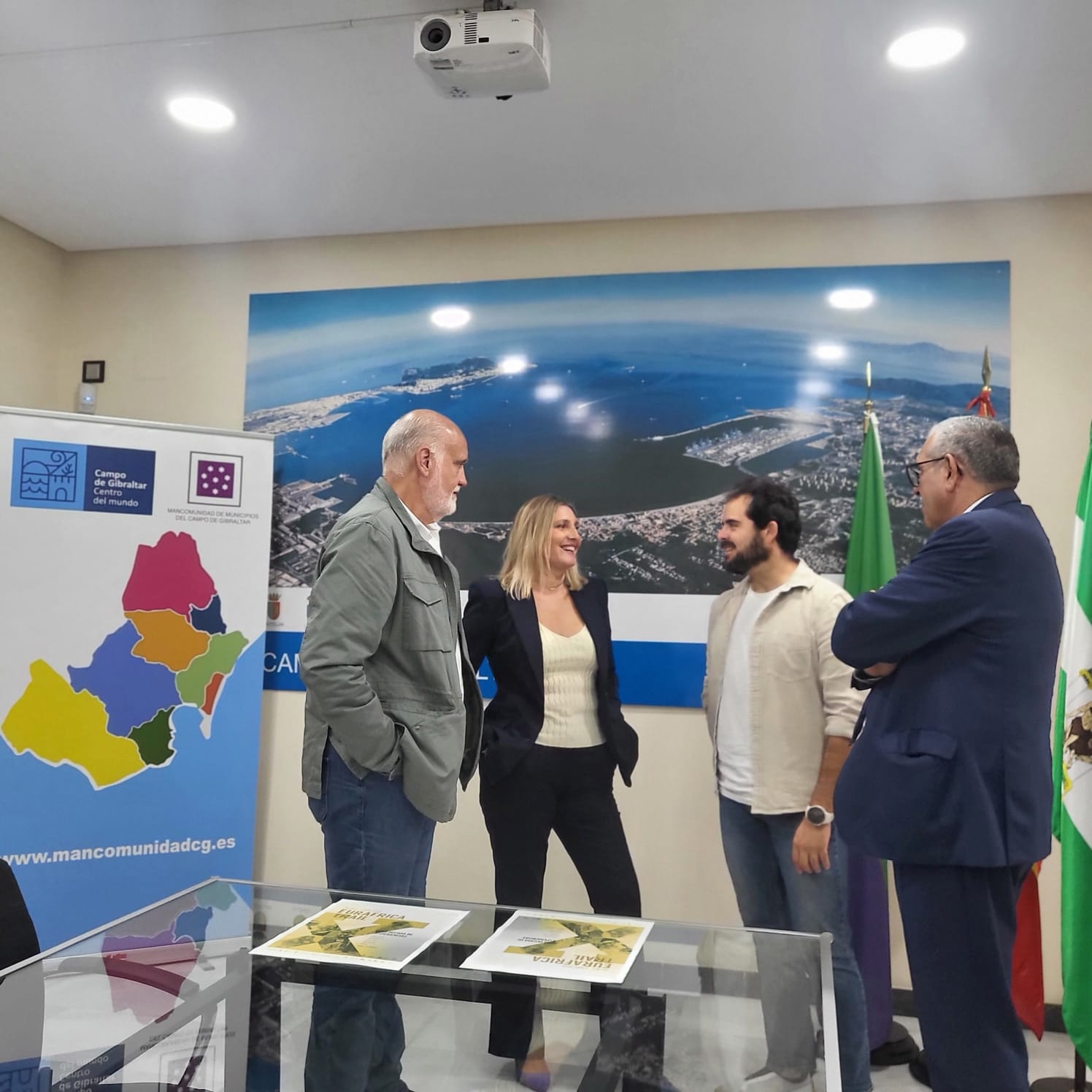 La presidenta de la Mancomunidad de Municipios del Campo de Gibraltar, Susana Pérez Custodio, junto al vicepresidente segundo de la Diputación Provincial de Cádiz, Francisco Javier Vidal Pérez, responsable del Área de Transición Ecológica y Desarrollo a la Ciudadanía, y el director de la prueba, Aitor Calle, han presentado la décima edición de Eurafrica Trail, una cita deportiva y cultural que, del 30 de octubre al 3 de noviembre de 2025, volverá a unir las dos orillas del Estrecho de Gibraltar a través de una carrera de montaña por etapas. El acto contó con la valiosa participación del Cónsul General del Reino de Marruecos, Abdellah Bidou.