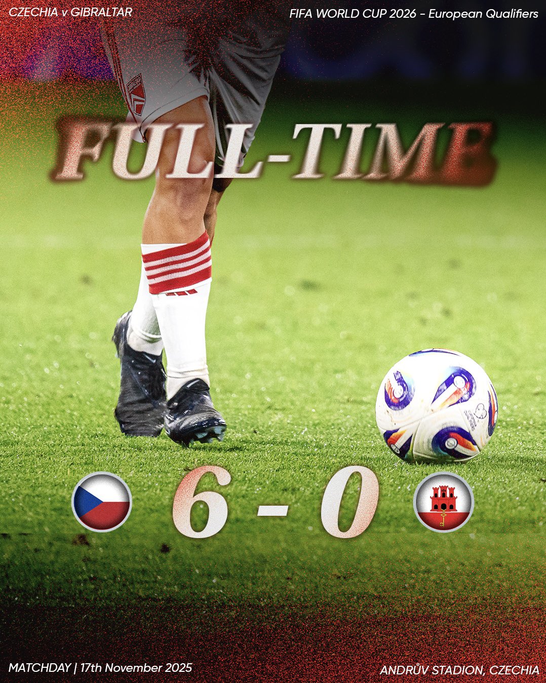 Con este partido se cerró la fase previa de este Grupo L para el Mundial 2026, donde Croacia ha quedado primera con 22 puntos y Chequia ha sido segunda con 16 puntos. Gibraltar finalizó en el último lugar con 0 puntos y 6 derrotas em 6 partidos. Ha anotado 3 goles y ha recibido 28.