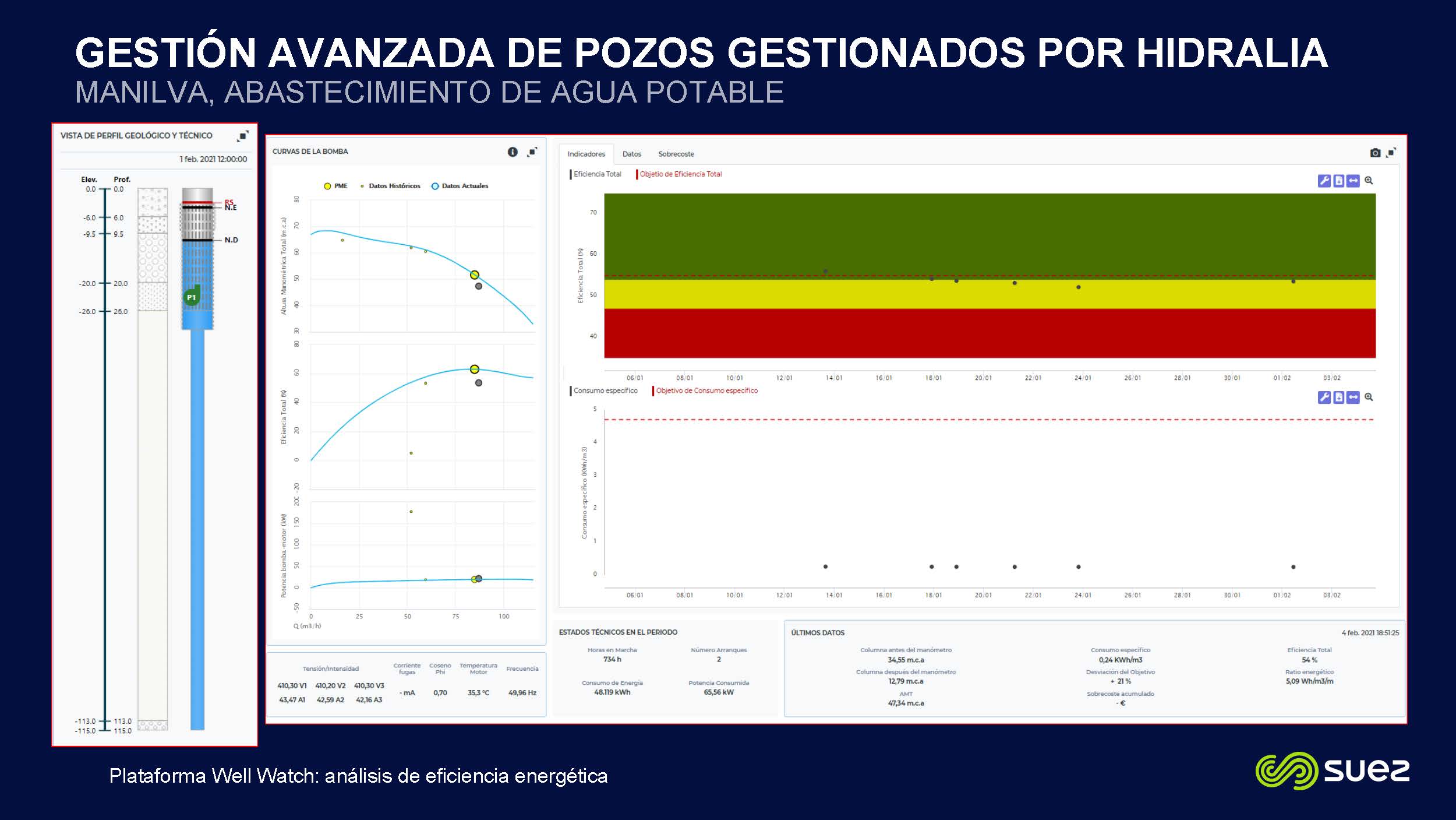 Well Watch es una herramienta tecnológica impulsada desde el grupo Suez que permite controlar en tiempo real las condiciones de las captaciones. Con ella se monitorizan algunos parámetros clave para observar el buen funcionamiento de las mismas, como los indicadores de la cantidad y la calidad de los acuíferos, el caudal específico de los pozos, los ratios de los equipos de bombeo (en kWh/m3 y en Wh/m3/m) y parámetros de funcionamiento en tiempo realque incluyen la profundidad del nivel de agua, el caudal instantáneo de bombeo, el consumo energético y la presión en cabeza de pozo.