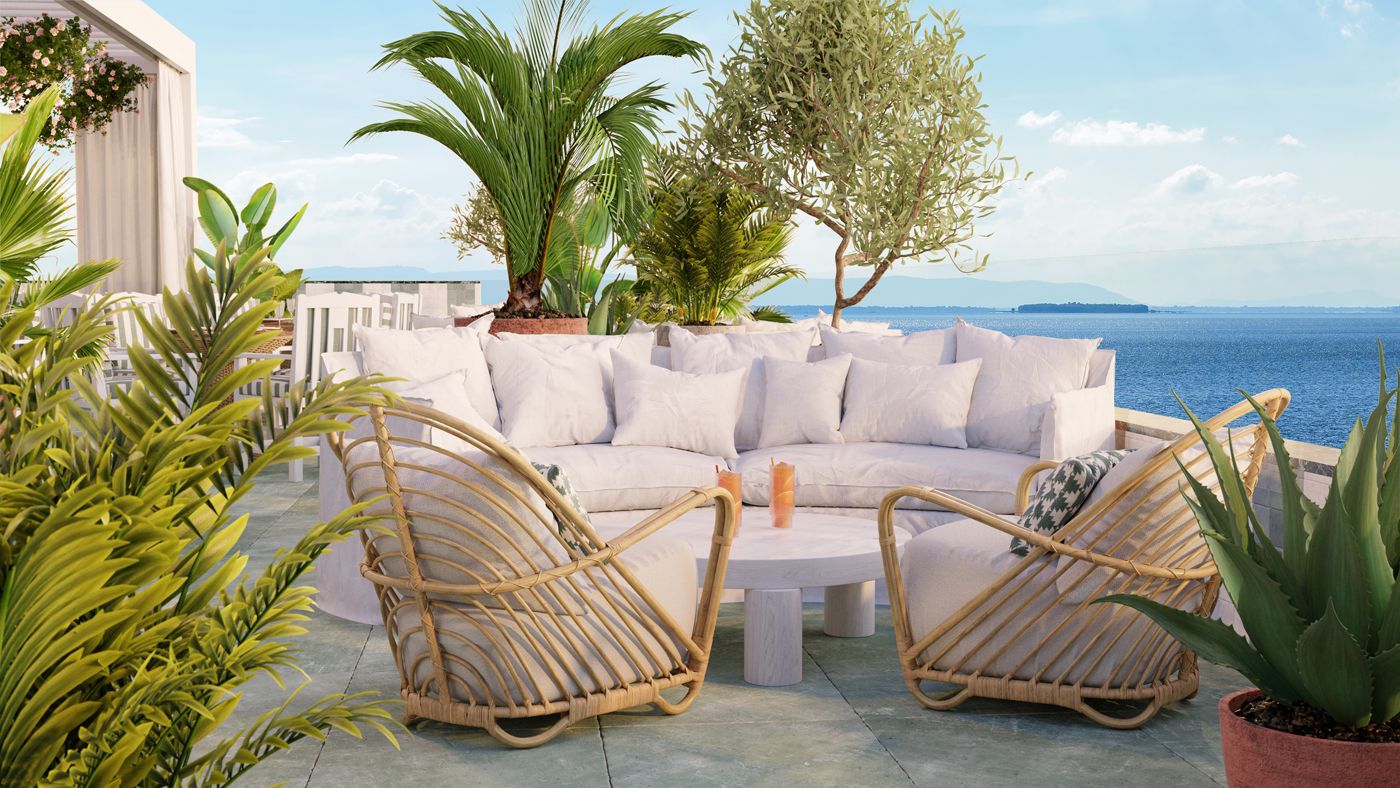 En lo que respecta a los materiales, utiliza piedras naturales, mimbres y pajas, y los mezcla con formas geométricas y estampados que dan dinamismo al conjunto.