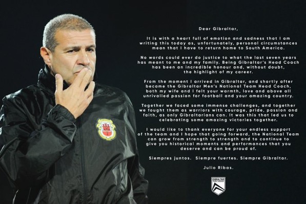 La GFA ( Asociación de Fútbol de Gibraltar ) ha confirmado esta mañana que el entrenador de la Selección Nacional Masculina de Gibraltar, Julio Ribas, ha dimitido de su cargo con efecto inmediato por motivos personales.
