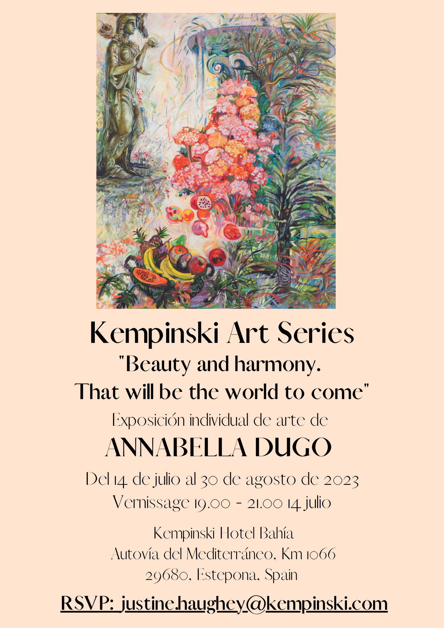 El 14 de julio, Kempinski Hotel Bahía inaugurará una exposición de Annabella Dugo como parte de su continua Serie de Arte Kempinski. El evento se abrirá con un recital de piano de Alessandro Lago, antes de que los invitados disfruten de un cóctel y tengan la oportunidad de ver las obras que forman parte de una colección llamada «Belleza y Armonía. Ese será el mundo que vendrá».