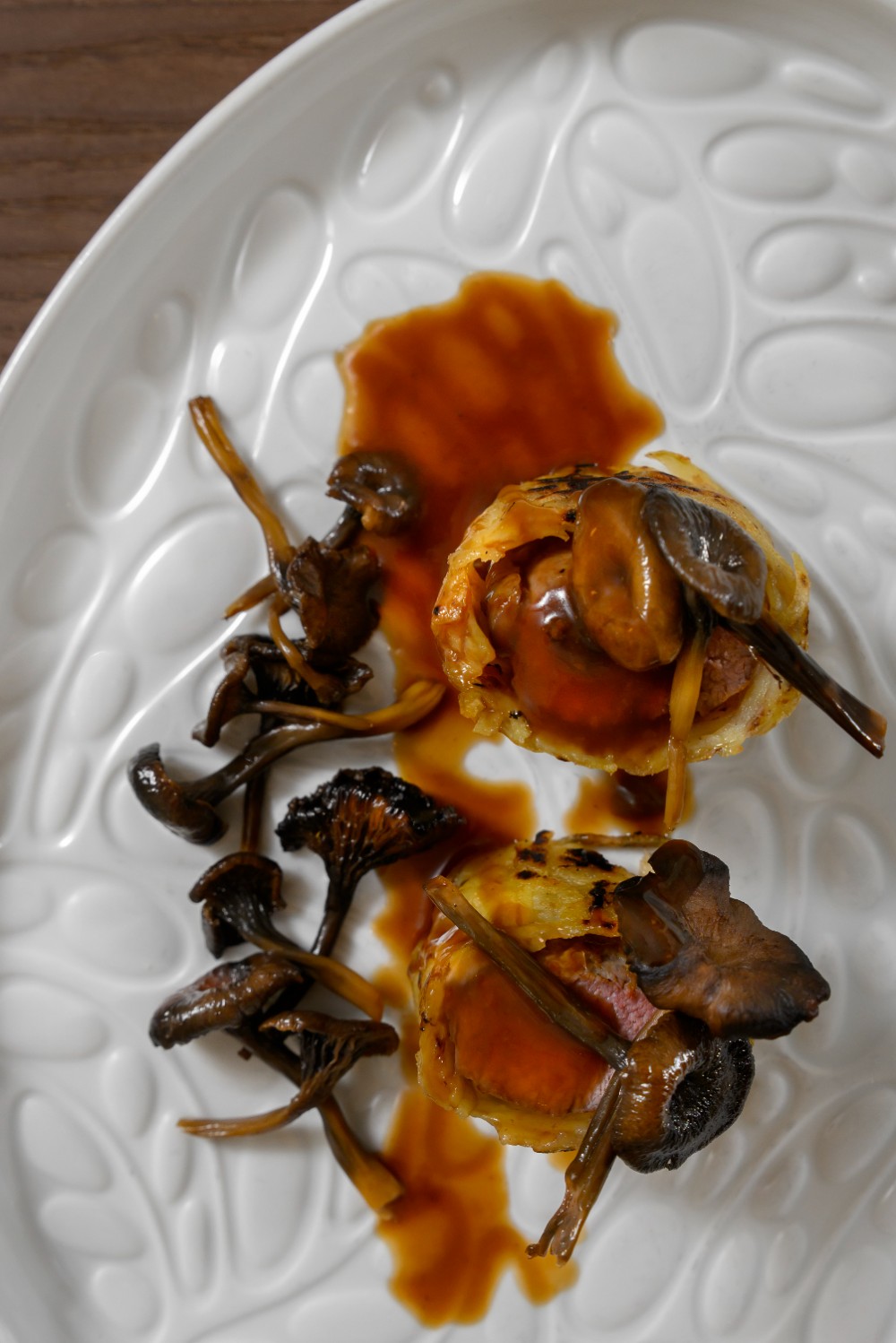 Plato menú de Navidad: Lomo de cordero en papillote de patata con su jugo tostado y angula de monte y Lenguado en popieta con colas de cigala, ratatouille de calabaza y gazpachuelo malagueño.
