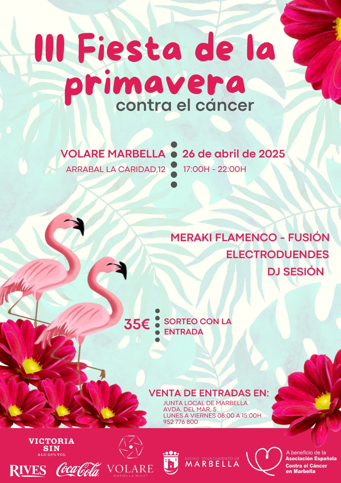 La diversión está asegurada en la Fiesta de la Primavera. Está enfocada hacia un público objetivo más joven, por eso se ha organizado una fiesta cien por cien ochentera con la participación de Los Electroduendes, que tocarán en directo versiones de los principales temas de la época. En esta edición se ha incluido también la actuación del grupo Meraki Flamenco Fusión y cerrará el DJ de la Discoteca Volare. Empresas como Rives sin alcohol, Coca Cola, Hotel Lima, Riversa, Cerveza Victoria 0,0, Gilmar, CB Abogados, el Esplendor de San Pedro y Montero Aramburu & Gómez-Villares Atencia abogados se han sumado también para mostrar su apoyo al trabajo que se realiza desde la Asociación Española Contra el Cáncer en Marbella.